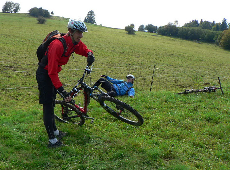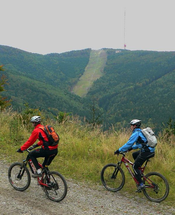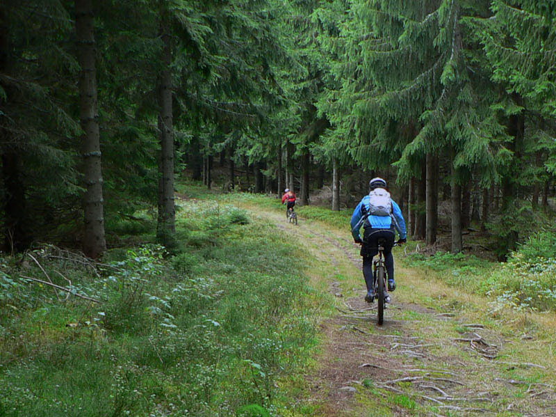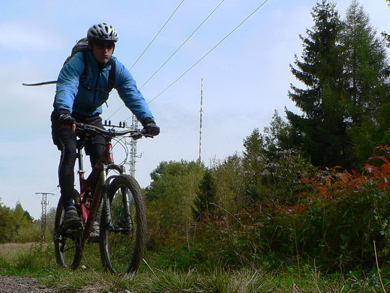 V Kremnických vrchoch je na mraky širokánskych lesných ciest s miernym stúpaním, ako stvorených na vykecávanie pri paralelnej jazde na bajku. Boli sme traja a niekde sme sa pohodlne vedľa seba vošli. Aj s pešiakmi sa dá pekne obísť, takže nenadávali, ešte sme aj s nimi hodili reč. Horšie je to pre tých, čo radšej singltraily a technické pasáže. Niečo sa isto nájde, ale treba poznať. Na jediný technickejší zjazdík na trase (od sedla Tunel) som chalanov nenahovoril, zdala sa im to dlhá zachádzka na Skalku.