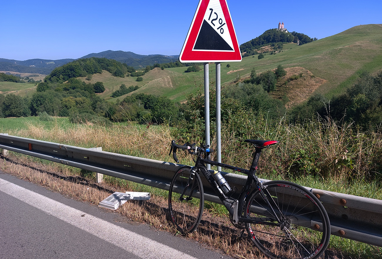 Po posedení pri kofole tých 12% z mesta hore nebolo síce nič moc, ale bolo to krátke, stehná nestihli ani veľmi začať páliť. A potom vertikálne aj horizontálne pekne vlnitá cesta s výhľadmi na kalváriu a okolie, teda hlavne na východ. Takou „náhornou planinou“ cez lúky. Známa „pivná“ dopravná značka potom aj v Podhorí, ale samozrejme už v opačnom sklone, tak ruky pevne na brzdy a išlo sa driftovať :-) Zase tie stroboskopy, ale slnko už zase zľava a nie úplne zhora – takže tiene plnšie, kompaktnejšie a prípadné nerovnosti neboli až také zamaskované.
