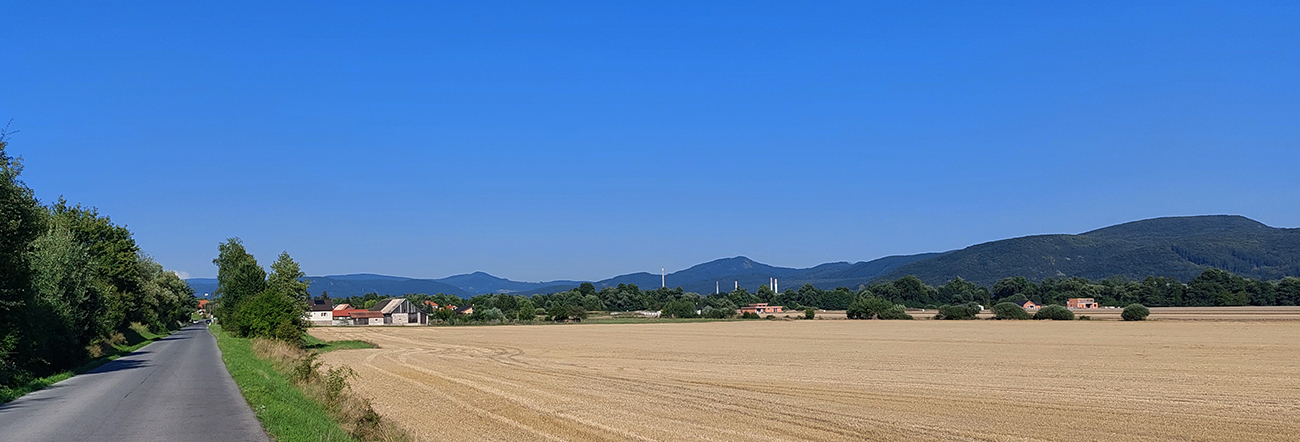 Z doliny do Hliníka som sa vynoril oproti panoráme hrebeňa Vtáčnika, no o chvíľu už som v Dolnej Ždani točil doprava, na východ, oproti panoráme hrebeňa Kremnických vrchov s dominantnou Jastrabskou skalou a komínmi hlinikárne v popredí.