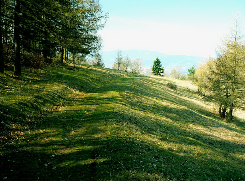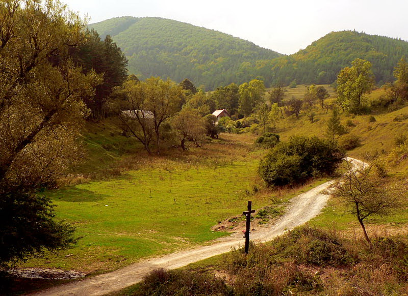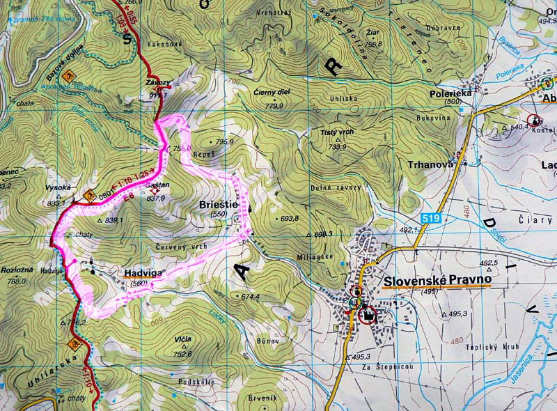 Po značke smerom na juh je to fajnovučká prechádzka po trávnatej ceste, striedajú sa lesy a zarastajúce staré lúky - hlavne na jeseň je to tu krásne farebné. Len si treba dávať pozor (hlavne počas pekných víkendov) na stáda besných zverov na motorkách. Do Hadvigy sa dá z červenej zísť asi troma cestami – nie sú síce značené, ale smer je jasný. Nazad do Brieštia je to už jednoduché. Z Hadvigy vedie dolu do kotliny jediná cesta, z tej treba len odbočiť pod dedinou doľava – buď pri kríži a dať sa krížom cez pasienky (to je krajšie), alebo nižšie za lesom po poľnej ceste. Obe cesty sa aj tak stretnú a cez kopček sa prehupnú do Brieštia.