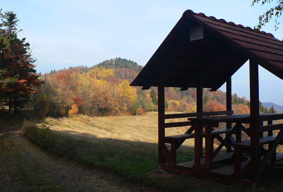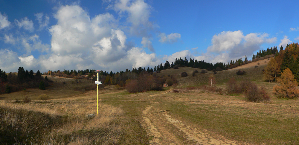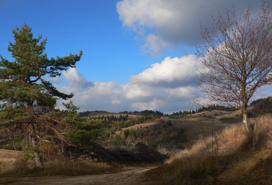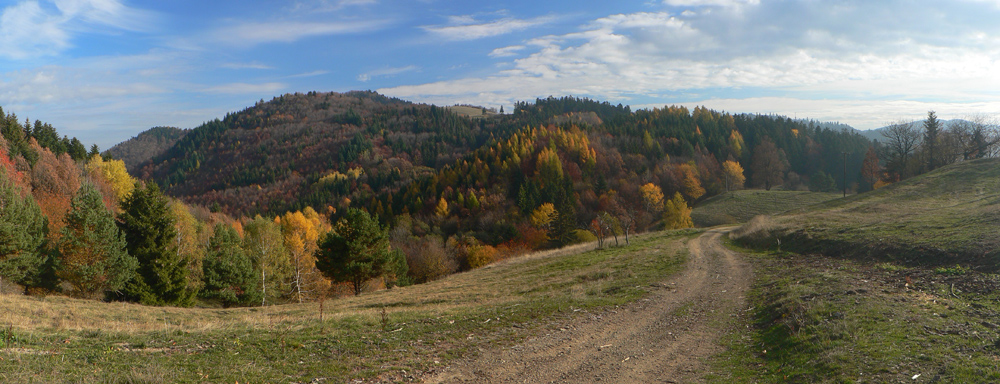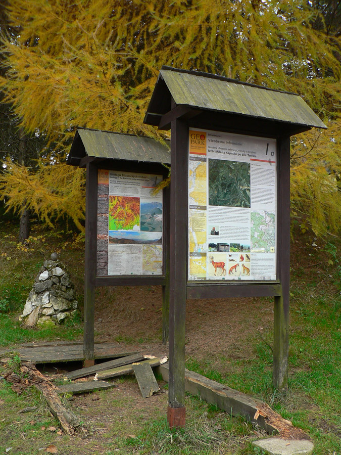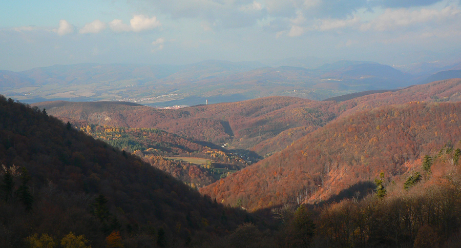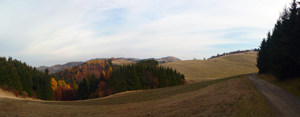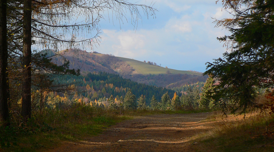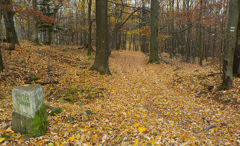 Štiavnické vrchy: tam sa dá motať po prírode, pamiatkach a cestách do zblbnutia. Krajina, ktorú vytvorila praveká sopečná a stredoveko-novoveká banská činnosť, je neskutočne pestrá. Keď sa k tomu prirátajú ostré a tiež pestré farby neskorého, novembrového babieho leta, netreba viac slov, treba ísť! Je jedno či pešo, či na bajku, väčšina tunajších trás je vhodná pre oba spôsoby pohybu. A v zime na bežky samozrejme tiež. Preto som tentokrát vyberal podľa množstva lúk, aby som sa len po lese nemlátil. Požiadavky pri náhľade do mapy spĺňal okruh okolo doliny, ktorá je jednou z hlavných prístupových trás do Štiavnice od Hrona – z Bzenice cez Vyhne a Banky.