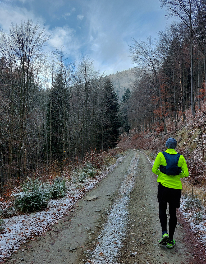 Toto stúpanie nie je dlhé ani prudké, striedajú ho aj klesavé úseky, pod nohami je príjemne – bielo a mäkko, napriek tomu mi to celé prestáva chutiť. Teda hlave to chutí stále, no telo z nepochopiteľných dôvodov stále viac štrajkuje. Nohy začínajú seriózne bolieť, ale čo je horšie, cítim, ako zo mňa odchádza všetka energia. Ale veď baterky dobíjam pravidelne a osvedčeným spôsobom! A natrénované mám túto jeseň toľko, že takýto výlet musí byť pre mňa lahôdka. Nerozumiem, ale kašľať na to - kríza príde a odíde. Akurát, že začínam zdržovať – najhoršie sa mi ide z kopca. Vatové nohy nedokážu vyrovnávať nerovnosti, došľapy začínajú bolieť tiež, periférne videnie sa zužuje... Hrôza toto! Ale aspoň oblaky sa trhajú, sem – tam slnko preblikne a cez „potrhané“ lesy sa otvárajú výhľady do Turca.