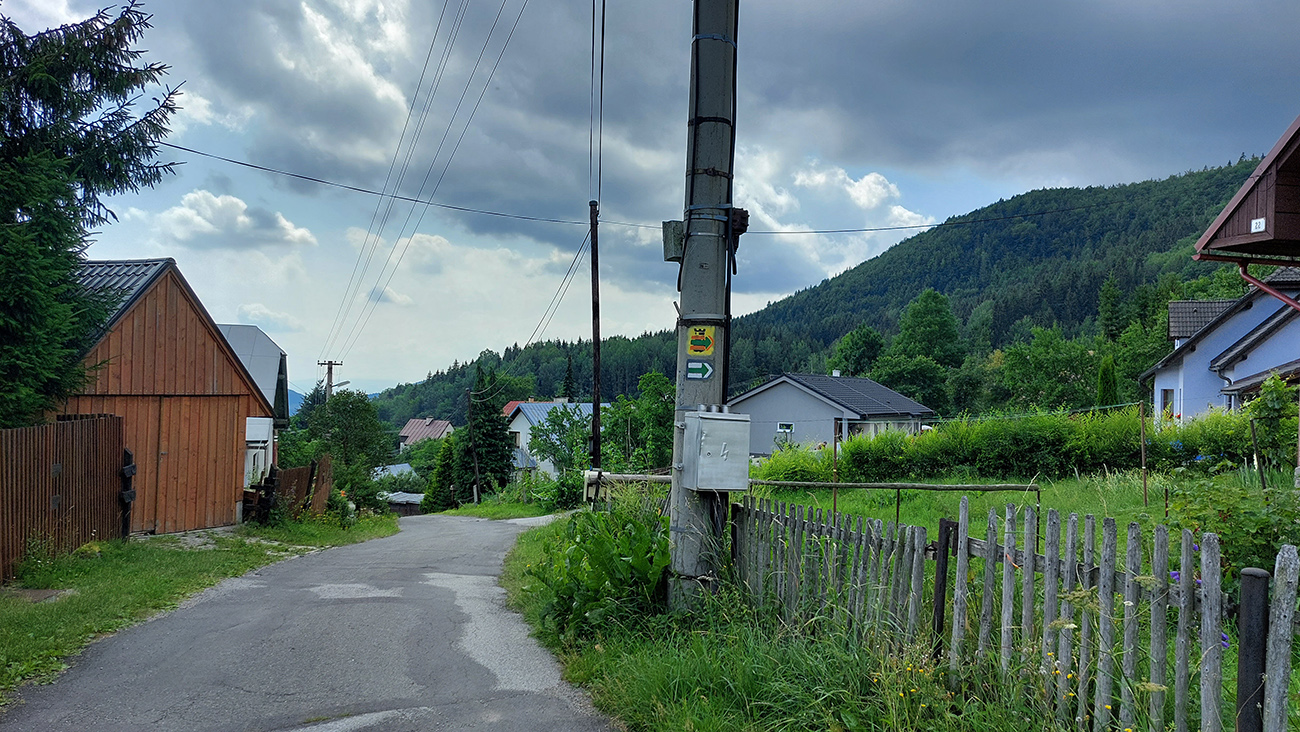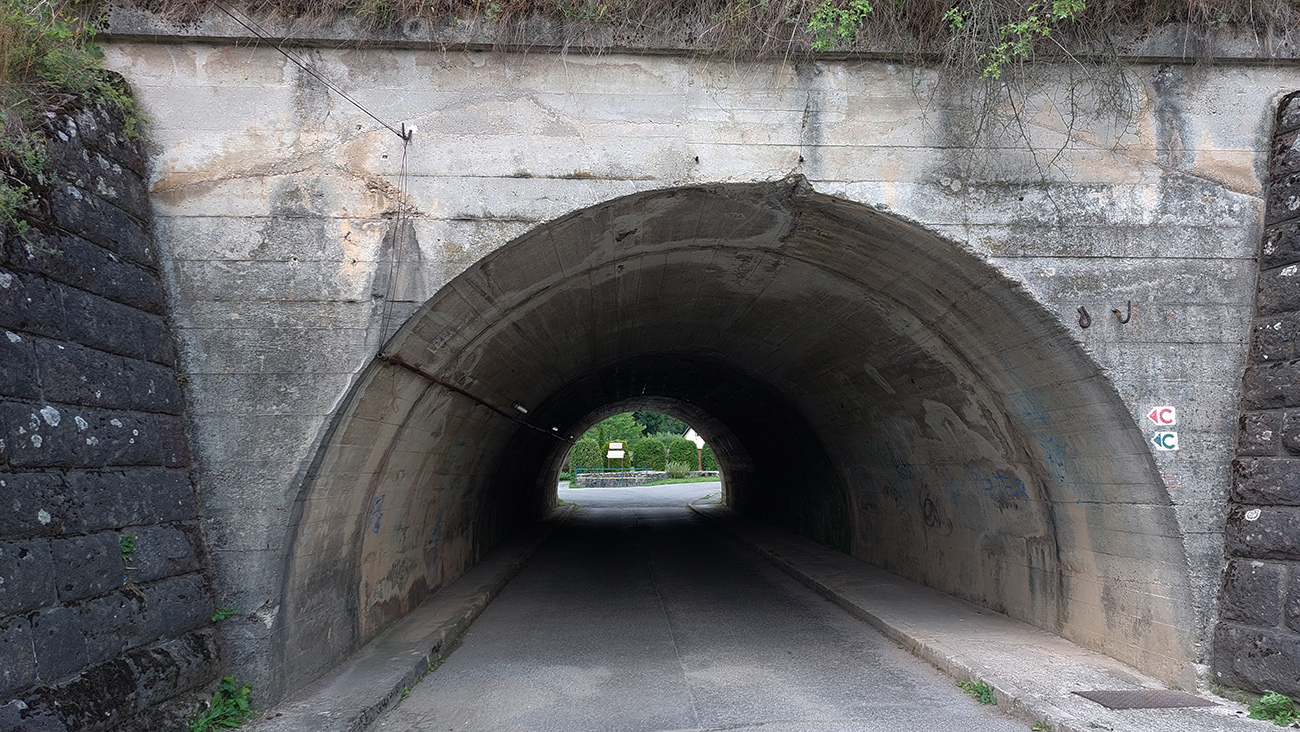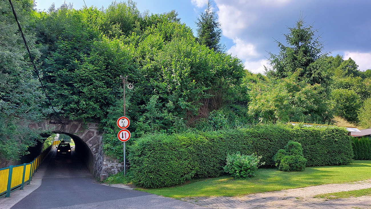 Zjazd po vlastných stopách pokračoval len chvíľu, aby som sa na križovatke Kaltrin pri hornom konci priehrady Turček odklonil doľava, dole do dediny Turček. To už bolo zasa asfaltovanie. Ku koncu ešte vyhliadka na priehradu a prešmyk cez dedinu, cez dva tunely popod železnicu. Inak na tej železnici je aj najkratší železničný tunel u nás, keby niečo :-) Na záver dedinového asfaltu krátka stojka v ústrety hrádzi.