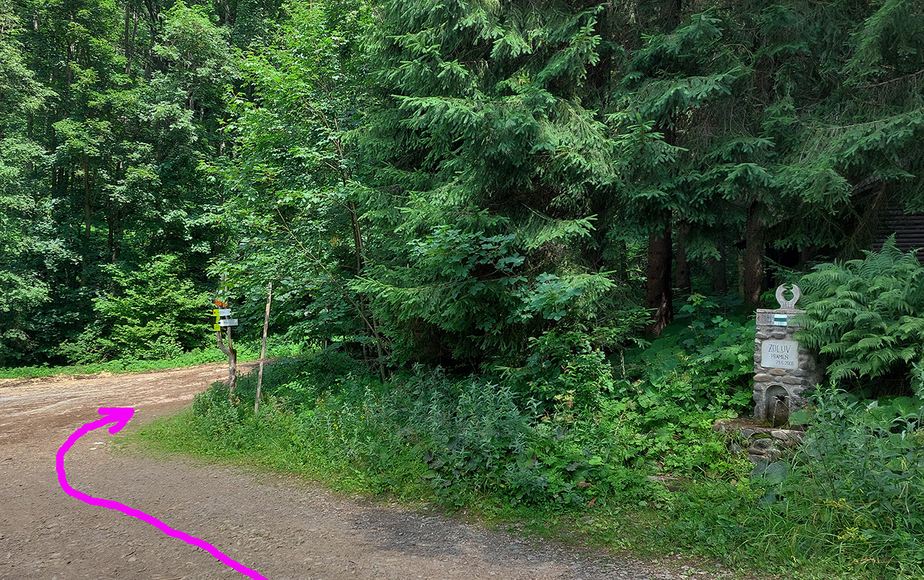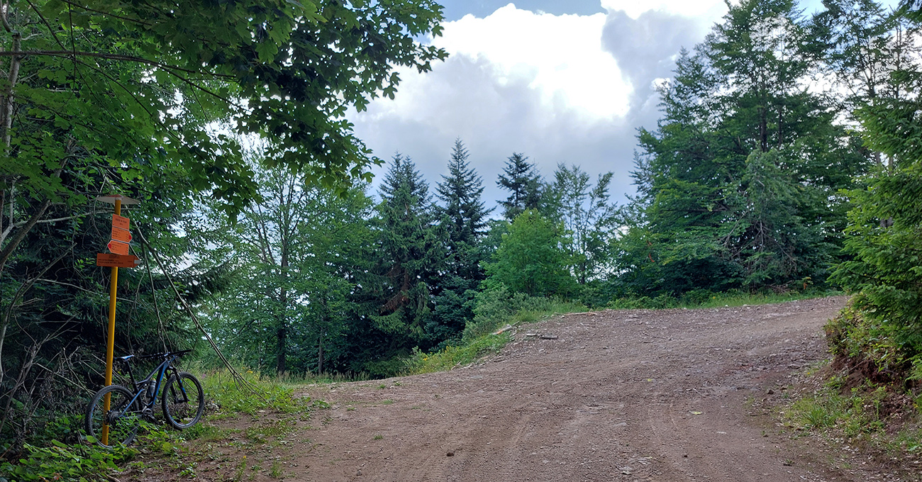Začiatok návratu cez chatu Hostinec je aktuálne viac rozrytá zvážnica a čerstvejšie rúbaniská s výhľadmi niekam na juhozápad. Pod Hostincom potom eróziou načatý strmší úsek po Šindliarku a superstrmá makadamová cesta k Zolovmu prameňu. Tiež cyklotrasa, ale hore by som tade ísť nechcel, aj keď je to krátke. Potom už vysoko pohodová a mierne stúpajúca, sem tam aj trávou zarastená cyklotrasa až na Skalku. Na rozdiel od skál na východnej strane hrebeňa tu prevláda pod kolesami hlina.