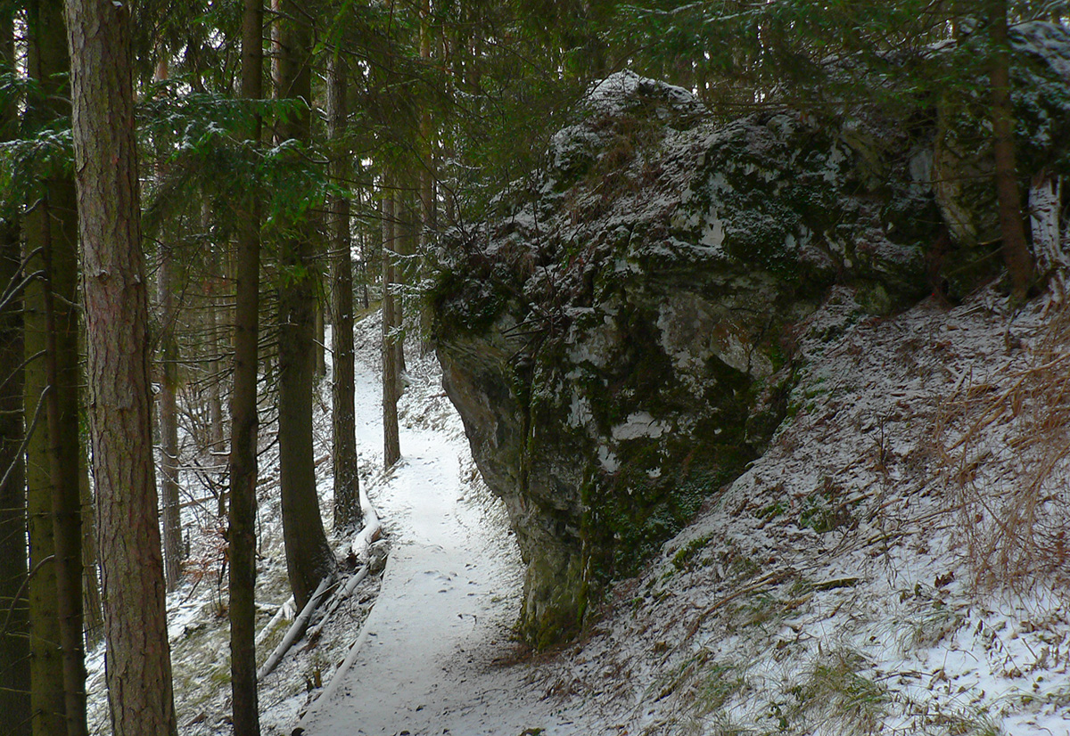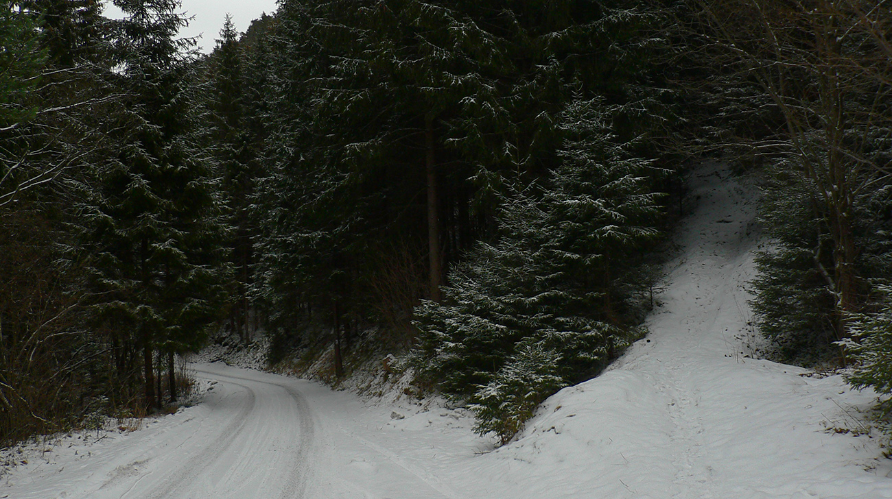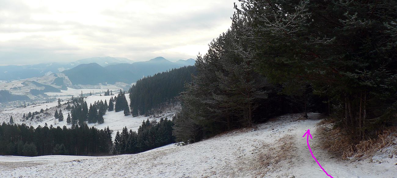 Spoza horizontu sa v celej svojej majestátnosti vynárajú bralá Halín, tak špekulujem či tam, či na Sidorovo. Strmota kombinovaná s maskovaným ľadom v stúpaní na Sidorovo ma ale presviedča, že na odbočku č. 3 budú Haliny predsa len lepšie. Tak si ich fotím „en face“ z malej plošinky, kde ma to podklzovanie prestáva baviť a o chvíľu už klušem cez lúky, okolo zverinca (teraz pustého) a hore do strediska k lanovke. Od nej jednoznačne označený, ale nejednoznačne prešliapaný chodník lesom na skalné vyhliadky. Je príjemné bezvetrie a aj hore snehu málo, ale je šedivo a veľké svetelné kontrasty, tak za nejakými lepšími panorámami sem musím prísť inokedy.