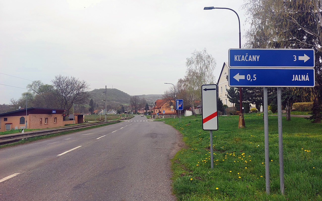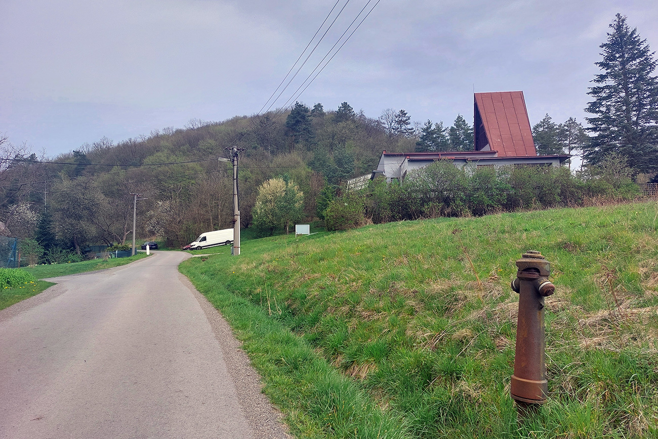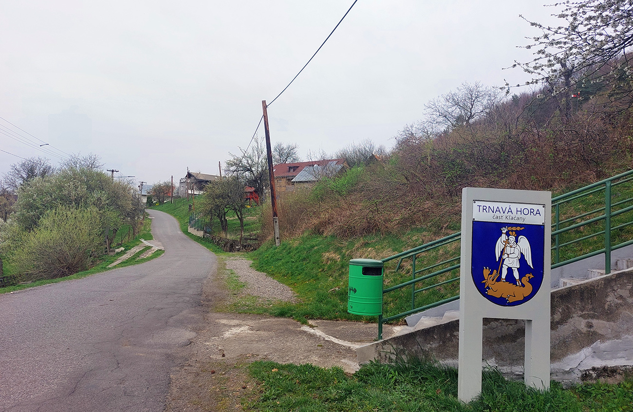Kľačany sú zas najvyššie položenou časťou Trnavej Hory, aj keď tabuľu majú ako seriózna obec :-) Aj tu je štart oproti stanici pri Hrone, tá ale patrí susednej Jalnej. 4,2 km a 290 v. m tiež začína poriadne strmo a najstrmšie je to pred železničným priecestím. Ale ďalej sa viac striedajú oddychové a prudké (aj dvadsiatkové) úseky. Prvý raz von spomedzi domov sa ide strmou serpentínou, nad ďalšou sú pekné výhľady. Strmé zákruty vedú strednou časťou obce, do ktorej sa vchádza cez „námestíčko Mekyho Žbirku“ – jeho busta s lavičkou je na múre hneď prvého domu. Narodil sa v ňom Mekyho otec. Sklon sa potom položí až do roviny popri „družstve“, no s výhľadom na tú tabuľu „Kľačany“ sa to zas dvihne. Ešte jedno vydýchnutie potom popri kostolíku a rybníku, a už vidno finálnu stenu. Úzku, našťastie krátku. A nad ňou zvonička, lavička a dokonca knižnička. S exkluzívnym výhľadom, aj na nasledujúcu Pitelovú.