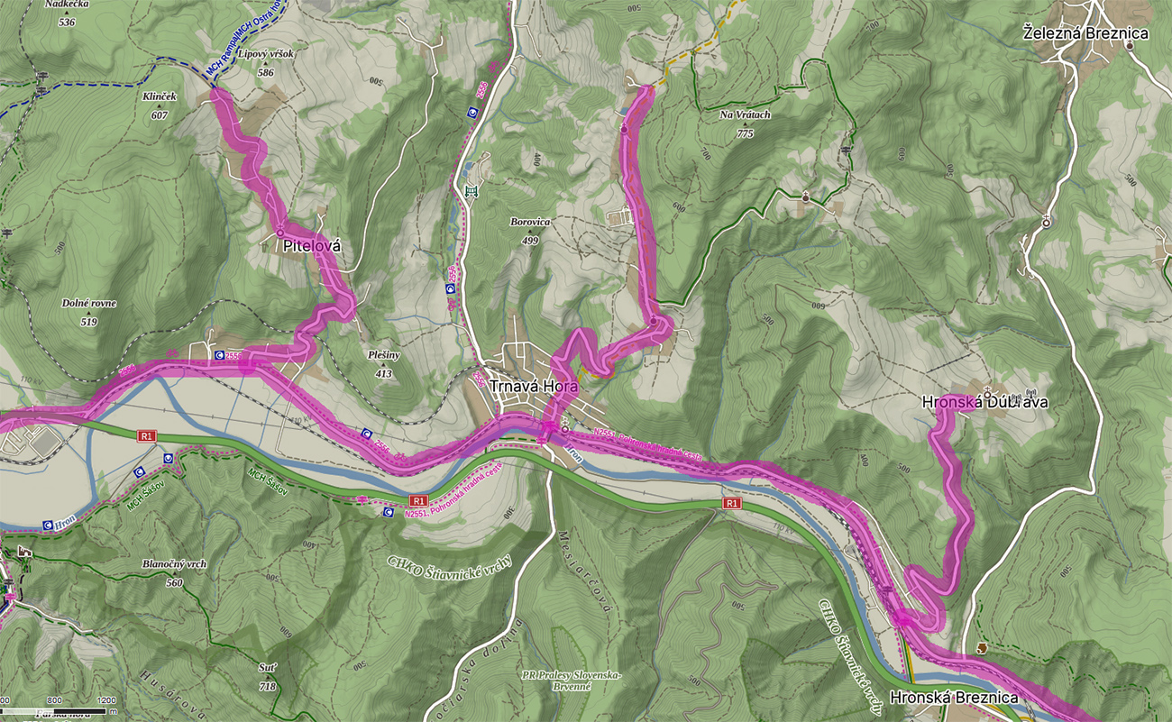 Cesta zo Zvolena do Žiaru, popri Hrone, popod južné svahy Kremnických vrchov, je už dávno vďaka R1 tichá, pritom široká a hladká, preto u miestnych žiletkárov obľúbená. Vlní sa len mierne hore a dole, takže kto si chce napumpovať do nôh dávku laktátu, musí odbočovať doprava. A pretože tento seriálik je o stúpaniach, ktoré hore (pre slušného žiletkára) končia, vynecháme teraz Budču, Železnú Breznicu či Nevoľné, alebo na druhom brehu Ostrú Lúku. Adélka odpustí... Povenujeme sa trom krátkym, ale dostatočne výživným stúpaniam, ktoré sú v názve. Aj poradie zachováme, tak ako nasledujú od východu na západ. Sú inak dosť podobné, nielen dĺžkou, ale aj sklonom a pár rokov už aj kvalitným asfaltom. Bonus je tiež spoločný: výhľady dolu do doliny Hrona a na severné úboče Štiavnických vrchov: