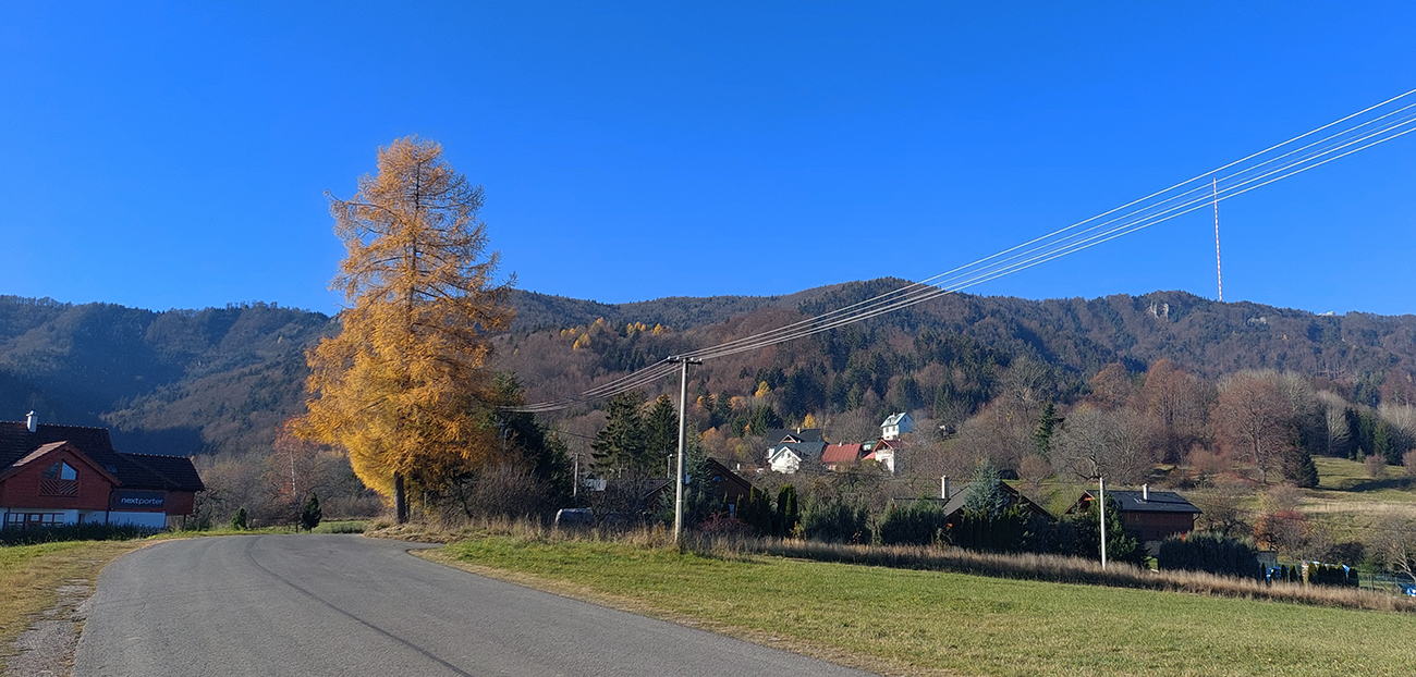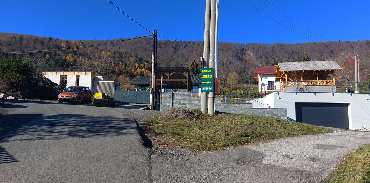 Aj keď cesta po pár stovkách metrov vylezie na oplotené pasienky, sklon sa moc nezjemní. Pár oddychových, rovnejších miest je tu síce, ale sú kratučké a vyššie v dedine zas brutus stupák. A tak až hore na križovatku, kde doprava ide cesta dole do Harmanca. Treba však ísť doľava, okolo OcÚ a kostola a ešte kúsok. Tam pri rozdvojení zelenej a žltej turistickej značky stúpanie končí, odtiaľ sa už cesta preklápa do mierneho klesania smerom na južný koniec dediny.