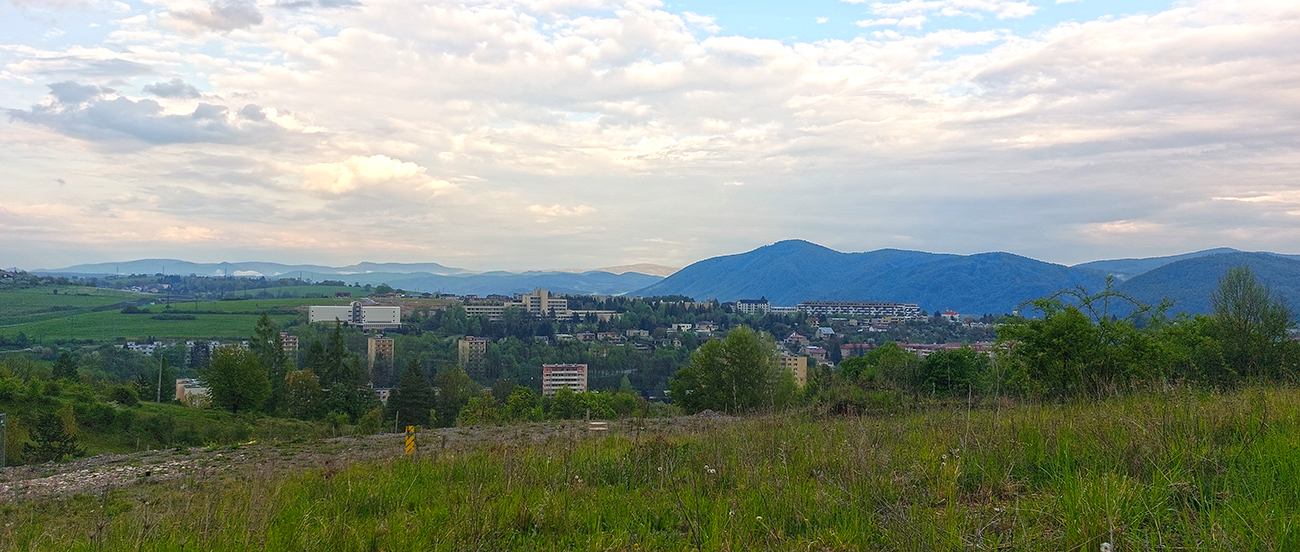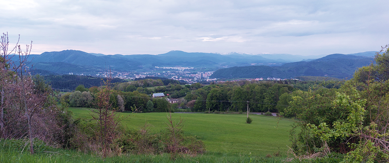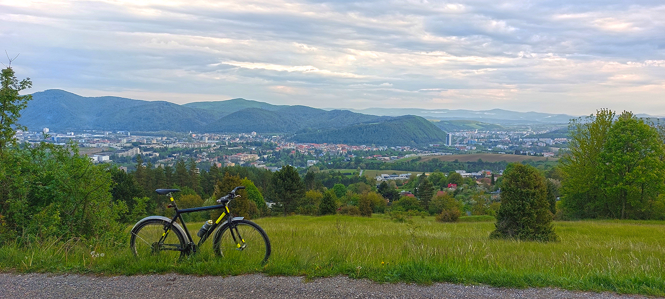 Tentokrát to bude priamo z mesta a tesne nad mestom, ale v peknej krajine s výhľadmi. V tom má BB známu výhodu, že je obtočená kopcami a doslova za pár minút je človek v prírode. Tak aj žiletkári si prídu na svoje - napríklad všeobecne známa je legendárna „stena“ na Šachtičky, kde sa robia aj preteky v časovke do vrchu. Výnimočné stúpanie – až sa divím, že sa ho ešte Imroman „mediálne nezmocnil“ vo svojom seriáli o najkrajších stúpaniach. Možno práve preto, že je skôr najbrutálnejšie ako najkrajšie :-) Ale aj na Šachtičky raz dôjde, niečo o nich je na MTBikeri TU . Teraz sa pozrieme na opačnú stranu doliny, na západný okraj mesta v podhorí Kremnických vrchov. No neľakajte sa fotiek - je to ozaj pre žiletkárov. Len počasie bolo také, že som nechcel moc zmoknúť a keď už, tak aspoň nie zdola. Preto som vzal zimák s blatníkmi. Ale on je to v podstate na asfalt preškolený starý bajk. Veď nech si aj on raz užije svojich pár minút slávy – lebo keď bol ešte mladý a terénny, Vetromag neexistoval :-)