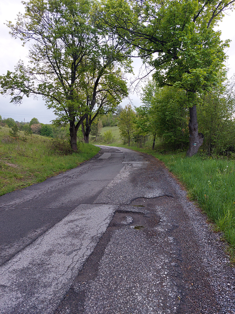 Cesta ale široká a asfalt výborný. Hneď na úvod sa to pod kolesami poriadne dvihne a cesta ide hustým, zeleným tunelom – človek má dojem, že nadobro opustil mesto. Ale po necelom kiláku sa objavia strechy, krajina sa otvorí a je tu prejazd „sídliskom“. Zato sa to na chvíľu položí, no za poslednými domami (zatiaľ), pri vodojeme, sa to znovu pristrmí. A takto sa to strieda až hore. Dokonca popri farme (asi v dvoch tretinách) je malé klesanie. Tam už ale vedie cesta peknou krajinou pomedzi lúky a ak by bolo času na obzeranie, sú tu pekné pohľady dozadu na mesto a ďaleké okolie. Za odbočkou na Malachov už vidno nábeh do najstrmšej strechy, až po prudkú zákrutu doprava, za ktorou už sa objaví dedina. Na jej začiatku (od budovy OcÚ) sa sklon zjemní až skoro do roviny, aby človeka následne dorazila finálna „dvacka“ od krčmy Pršianka po koniec asfaltu. Celé to má asi 300 m stúpania na piatich kilákoch, sklon priemerne 6,2 % - ale ako som už písal, striedajú sa strminky a rovinky, nie je to súvislé. Segment na Strave je TU .