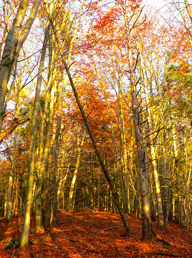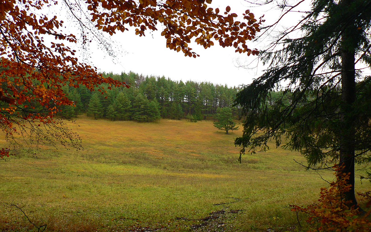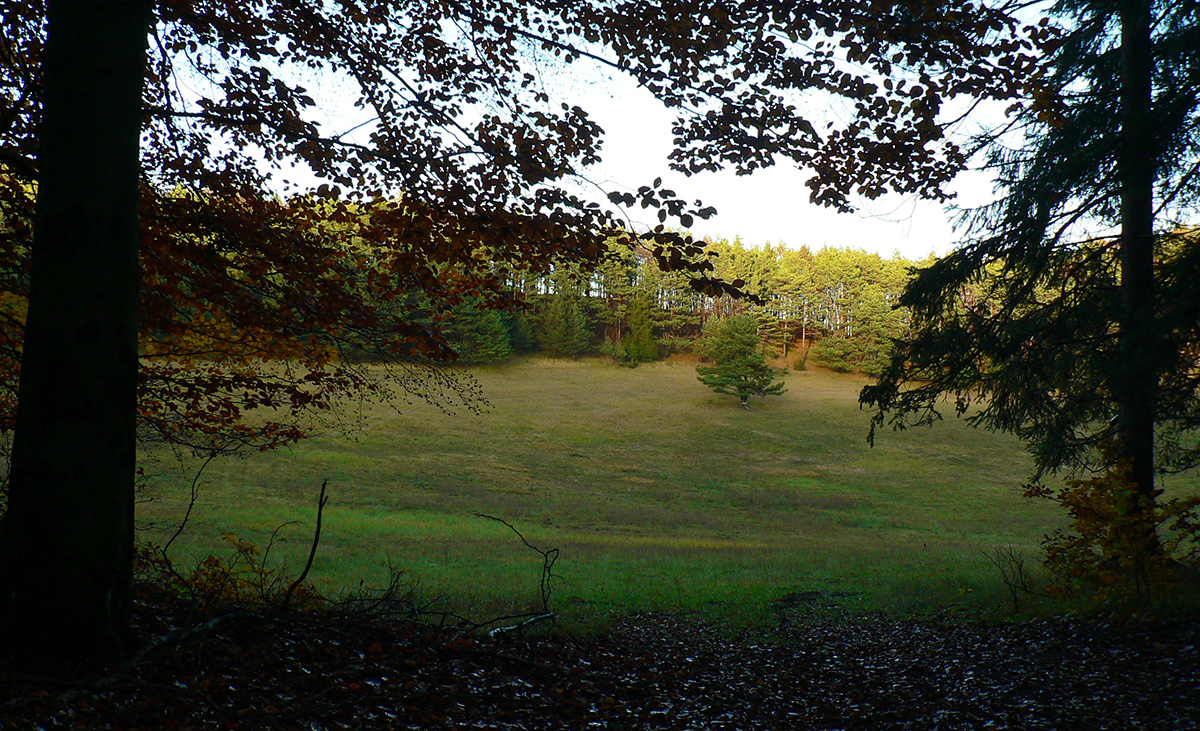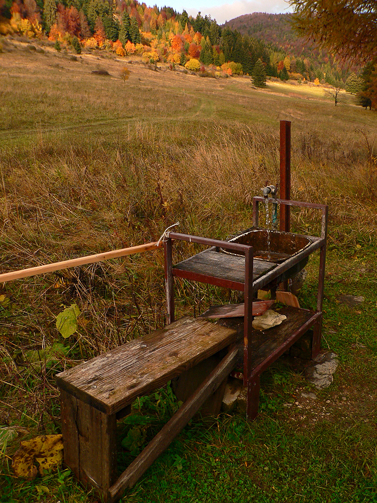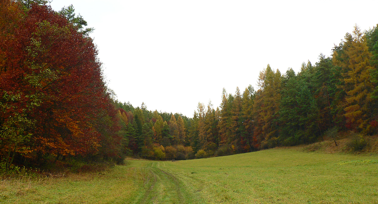 Nazad na červenú som sa dostal na tej istej lúke, na ktorú som ráno vyliezol z doliny. Ale tentokrát ma nelákala cesta nazad do Rudna po dne doliny (veľa mlák na ceste), skúsil som radšej po bočnom hrebeni, cez lúku, kde som ráno fotil tie jelenice. Cesta cez lúku (paralalná s tou dolinovou) bola OK, ale v lese rýchlo zanikla. Nevadilo, prerazil som lesom cez vrchol Vlčej (753 m), poplašil som posledné stádo, tento raz poriadne (aspoň 50 kusov), strmo som zbehol čerstvým rúbaniskom a vynoril som sa znovu na lúkach nad plechovým „družstevným senníkom“, kde som bol už dvakrát. A to už bolo do dediny na skok. Veď bolo aj načase - už sa začalo šeriť. No čo by som chcel, že? Zimný čas a krátko po štvrtej, posledný deň októbrový.
