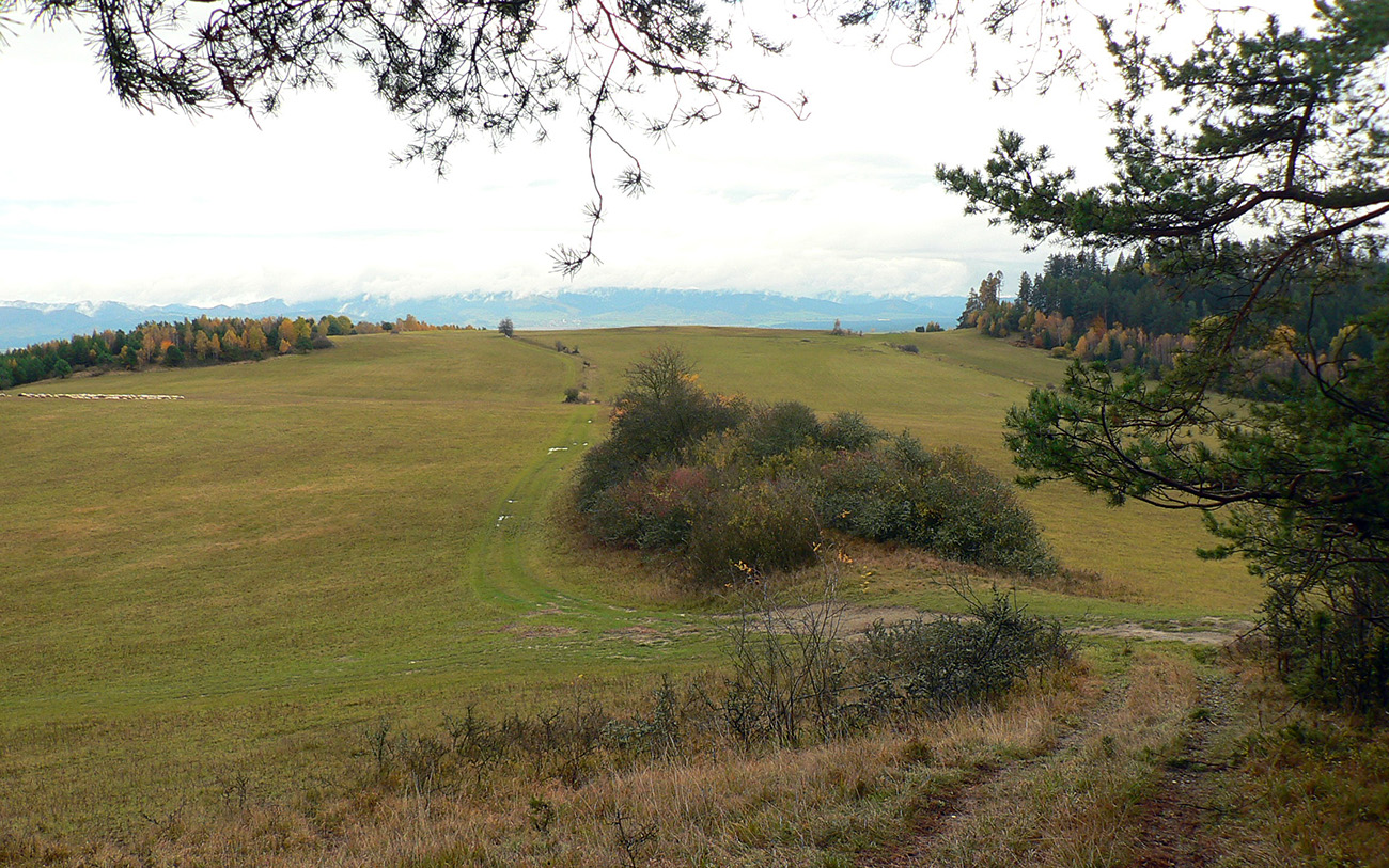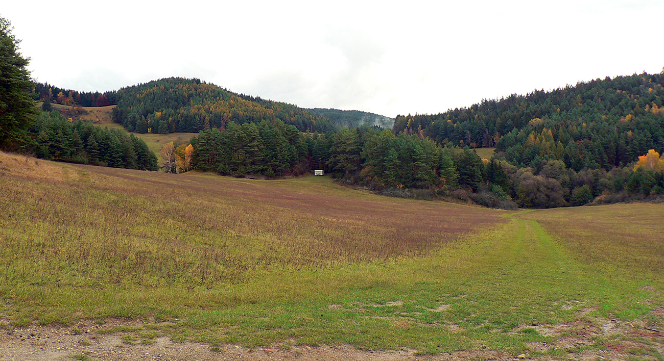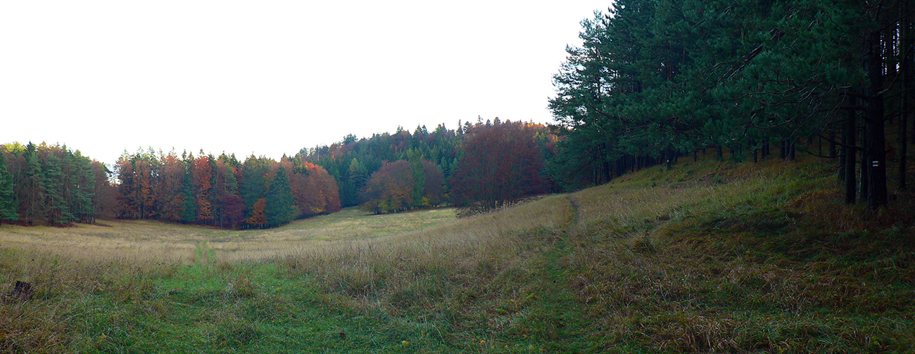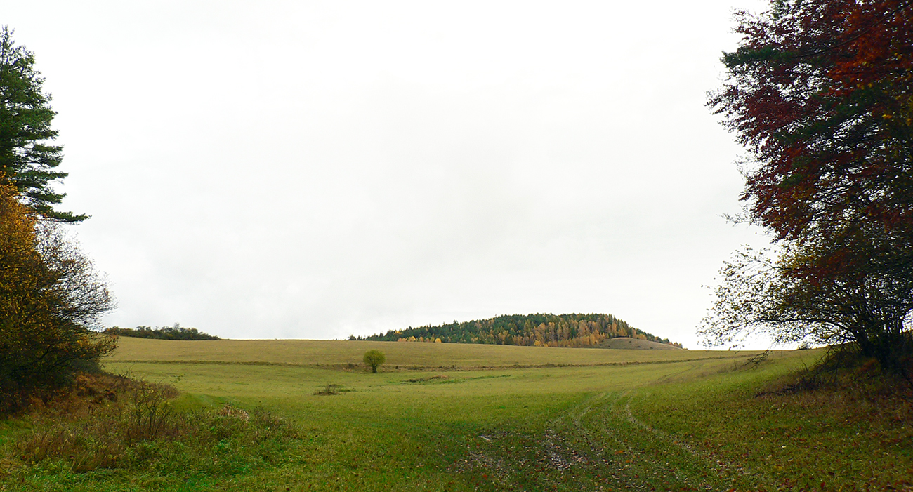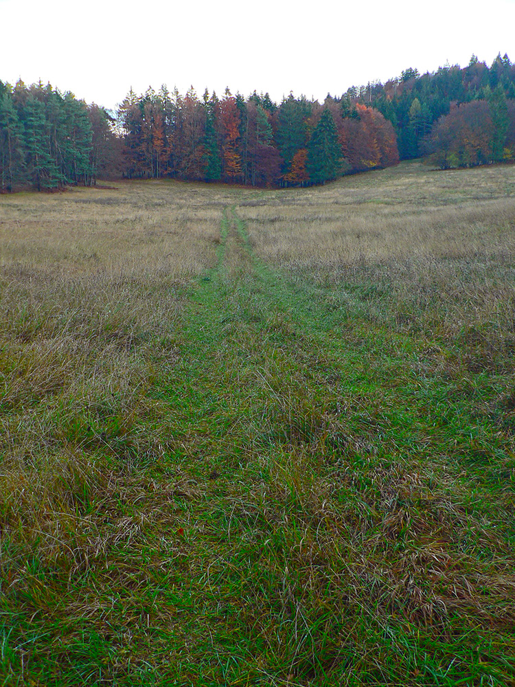 Najprv dlhá úzka lúka dolinou, potom ešte užší priechod pomedzi lesíky a rooooozľahlé lúky. Držiac sa okraja lesa pri ľavej ruke som to nasmeroval priamo na sever, na horizont. Cesta hore lúkami ma viedla jednoznačne. Z horizontu sa okrem tej mojej rozbieha ďalších päť ciest, ale to už som videl, ktorou sa mám spustiť nazad do doliny Rudnianskeho potoka a aj kade potom z doliny odbočiť do začiatku „severnej časti osmičky“. Takže bol čas na malý prieskum dvoch najlepšie vyzerajúcich ciest - doľava, do kopca: