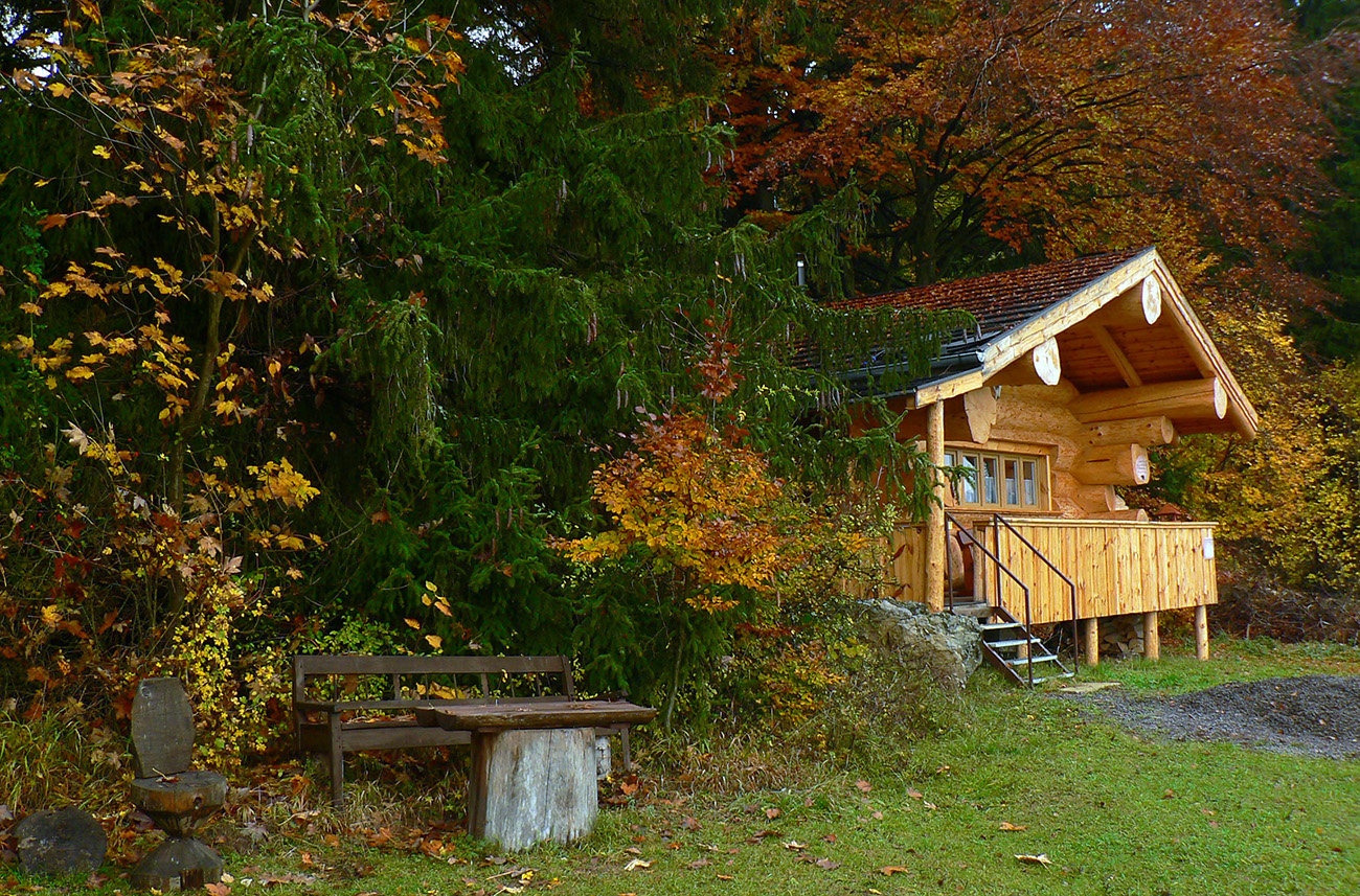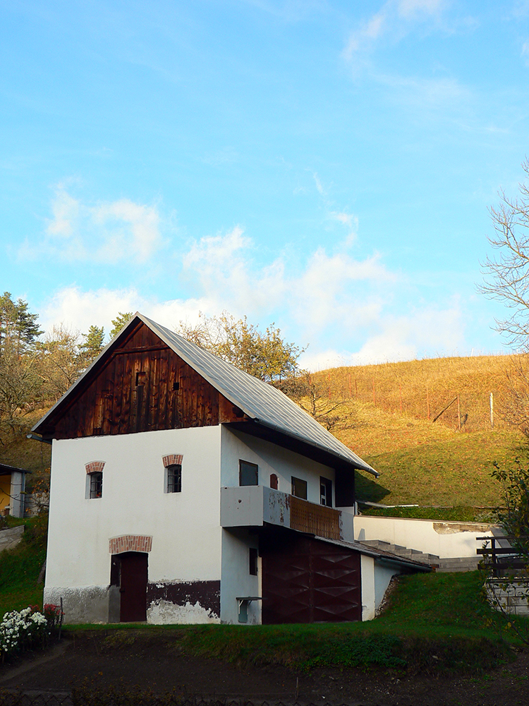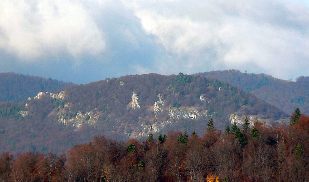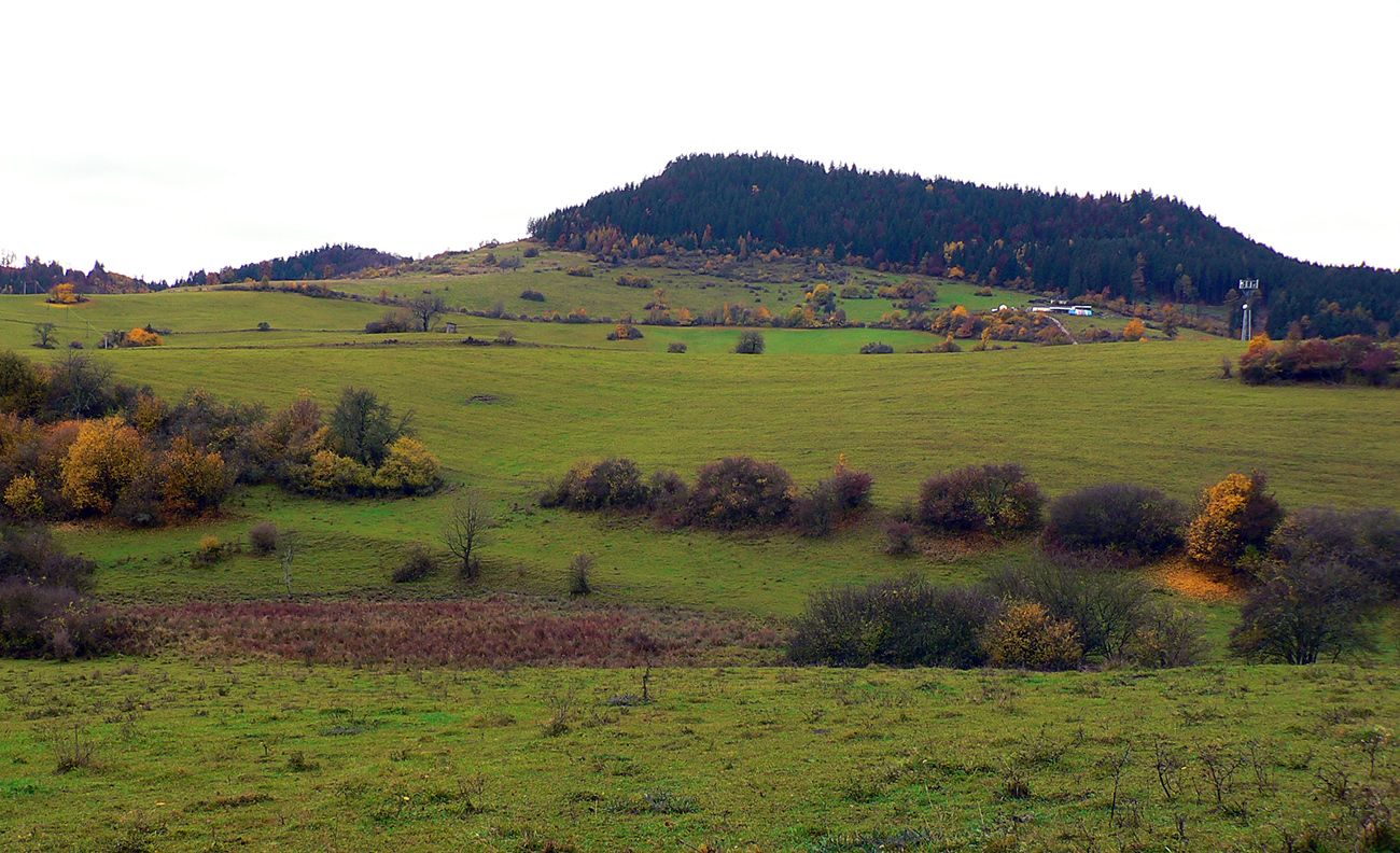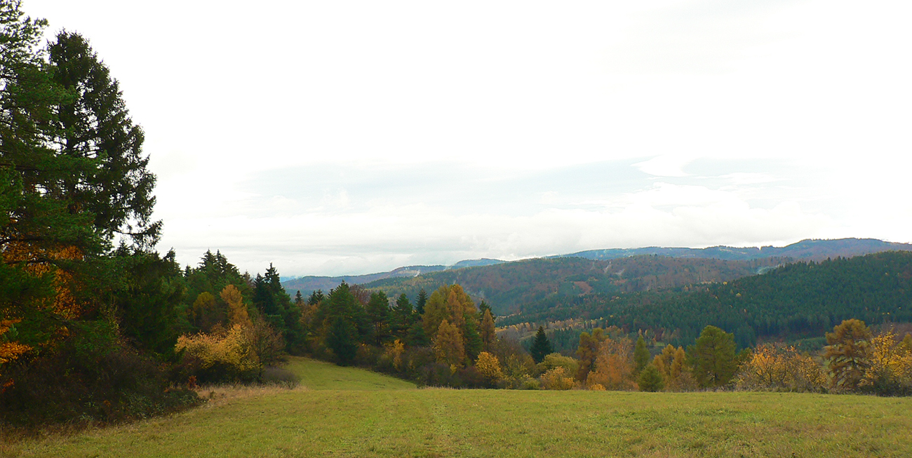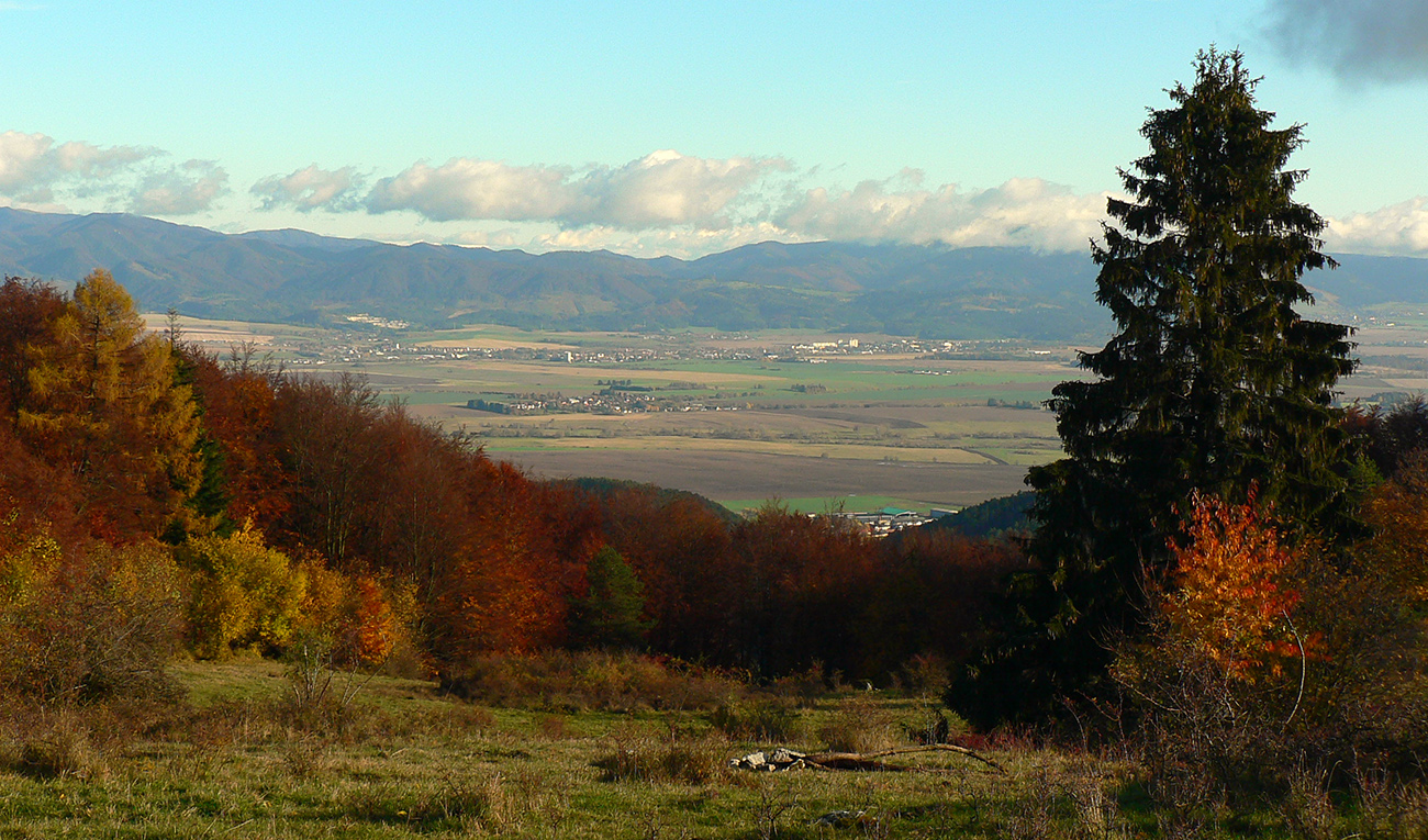 Vyšlo to tak, že jednou som šiel tam a druhou som sa vrátil. Tá viac vľavo ma doviedla ku starému ovocnému sadu, tá druhá je prístup k novej poľovníckej chate. Nooo, parádny výhľad si páni jágri zariadili. Ponad Rudno do kotliny, až k Veľkej Fatre. Nad ktorou sa inak už začala sivota trhať a modrá začala presvitať. Možno z tých jesenných farieb dnes predsa len niečo bude...