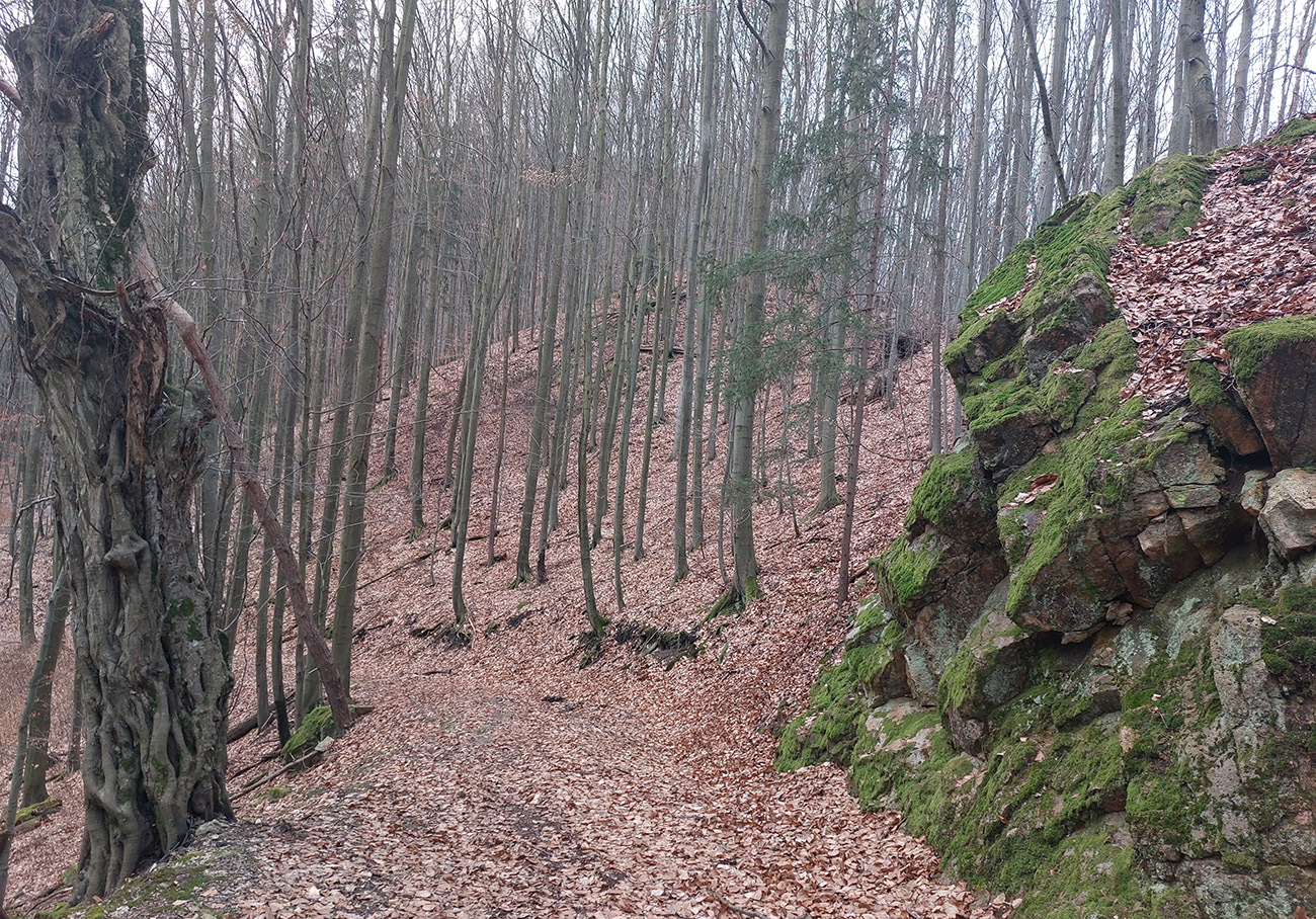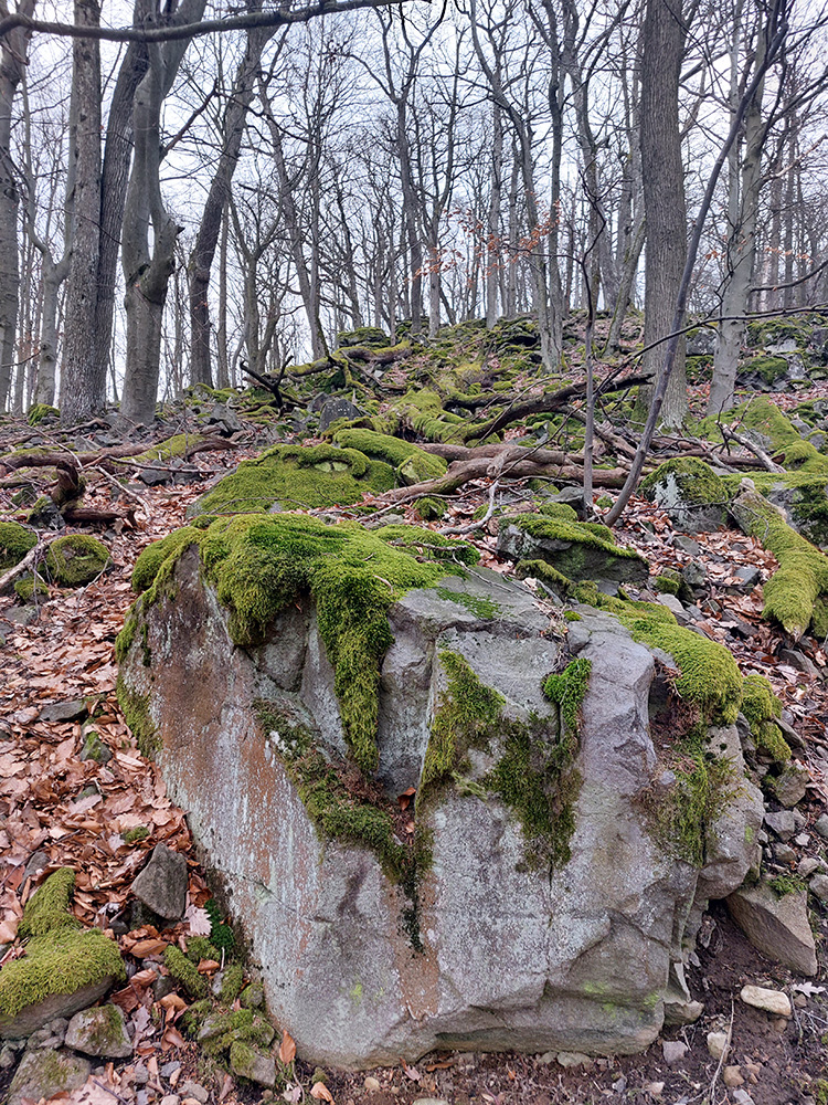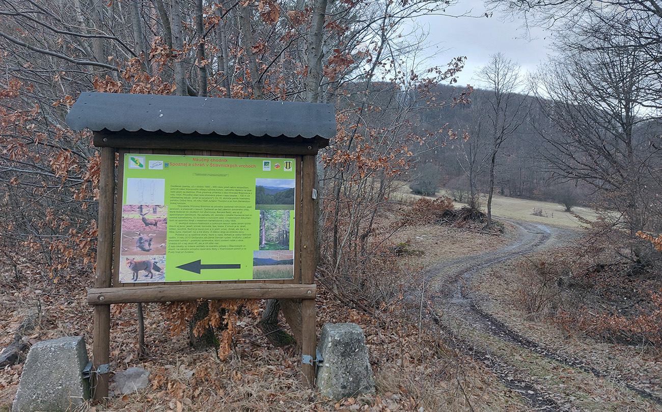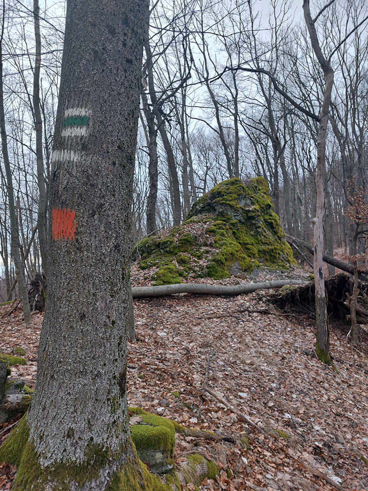 Pod ďalší Demian (sranda, že sú tu dva tak blízko seba) vedie príjemný traverzový chodník. V sedle pod vrcholom machovozelená skalka a pod ňou smerovník v bukovej húštine. Hore som nešiel, fotky odtiaľ sú TU – radšej som pošetril čas a cestu do civilizácie som si trošku predĺžil odbočkou na náučný chodník. Ten je inak otabuľovaný a ošípkovaný poctivo, len tá jedna moja odbočka nie je. Tak som sa trochu vrátil, a o chvíľu som už z lúk nad Breznicou pozeral priamo na začiatok výletu – masív Brda naproti cez dolinu Jasenice:
