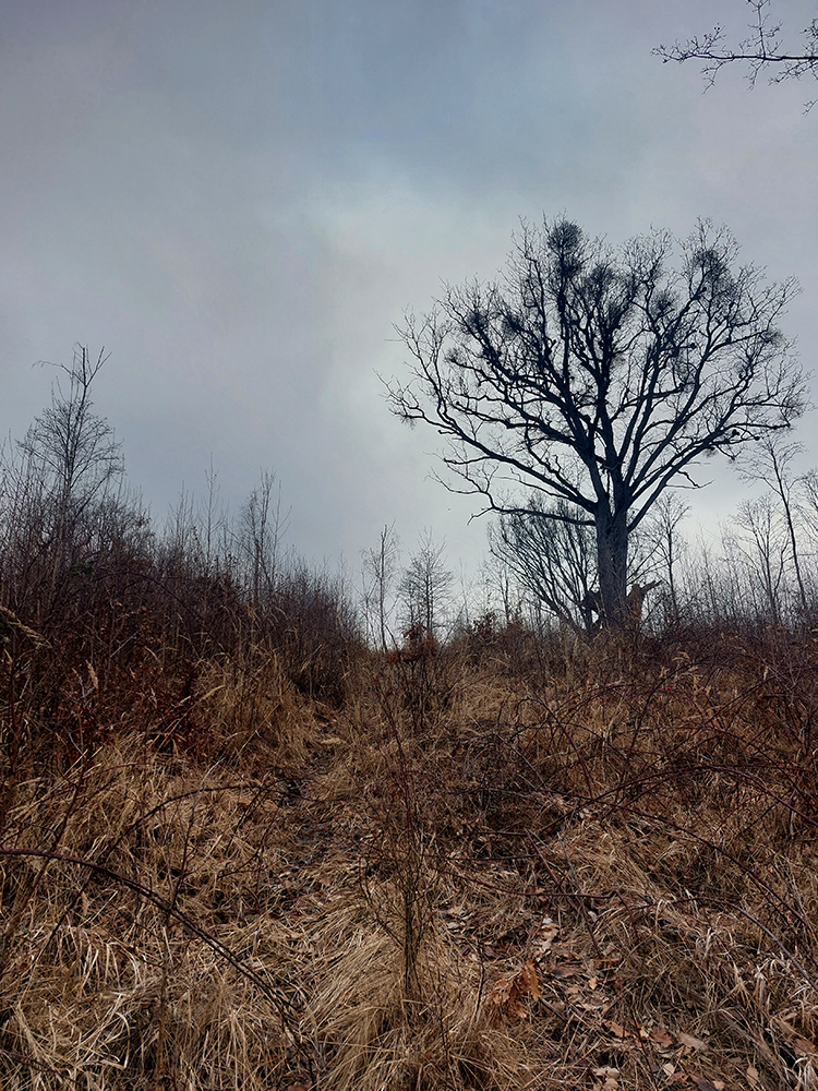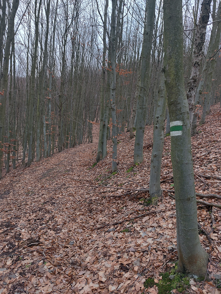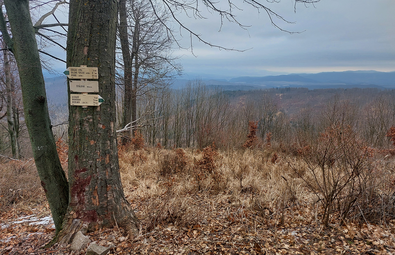Nasledovali prevažne behateľné, ale nie veľmi zaujímavé zvážnice, len párkrát sa v diaľke vpravo ukázal Močiar, v strede veľkých lúk. Ale ten si nechám na leto na mtb, sú tam v okolí fajné cesty. Podklad pod nohami sa postupne vylepšoval, len zrazu odbočka do lesa a iba značky, žiadny chodník! Strmé stúpanie na Štálovo (836 m), zhora len obmedzený výhľad na východ (Poľana, Javorie...) a rovnako strmo dole.