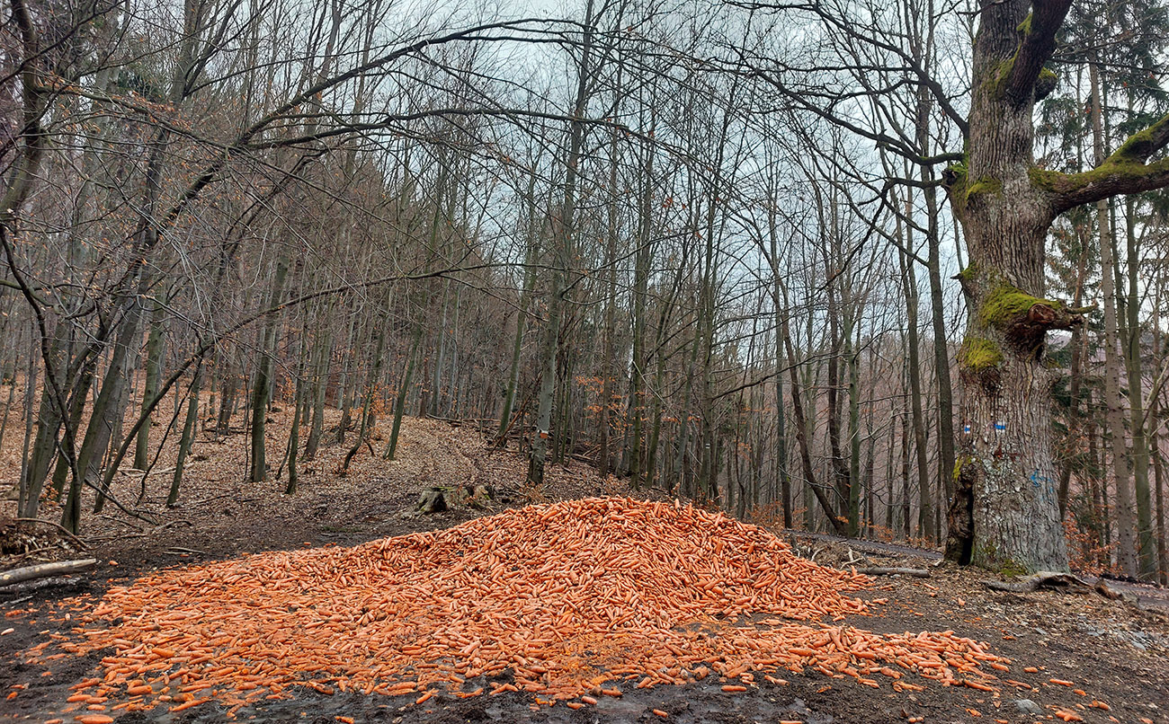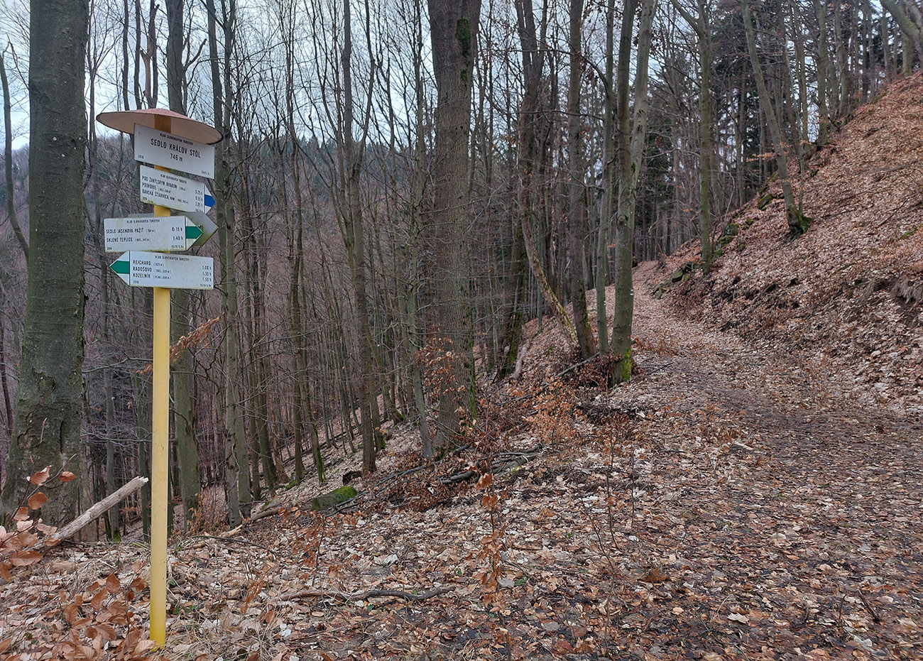 V sedle Kráľov stôl napriek bomba názvu len križovatka zvážnic v lese, prepol som na modrú a začal som úsek v protismere trasy Štiavnického ultrapunku . Aj by som sa najedol cestou, takú hromadu mrkvy som minul :-) Chúďatká zvieratká majú ozaj teraz stav núdze, nenajedia sa v tých závejoch snehu, treba prikrmovať mohutne, že?