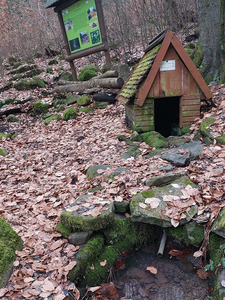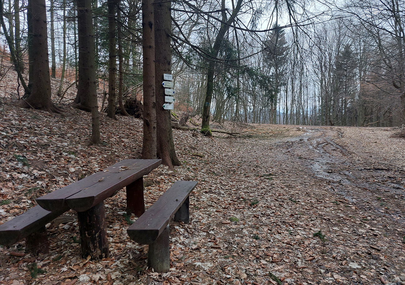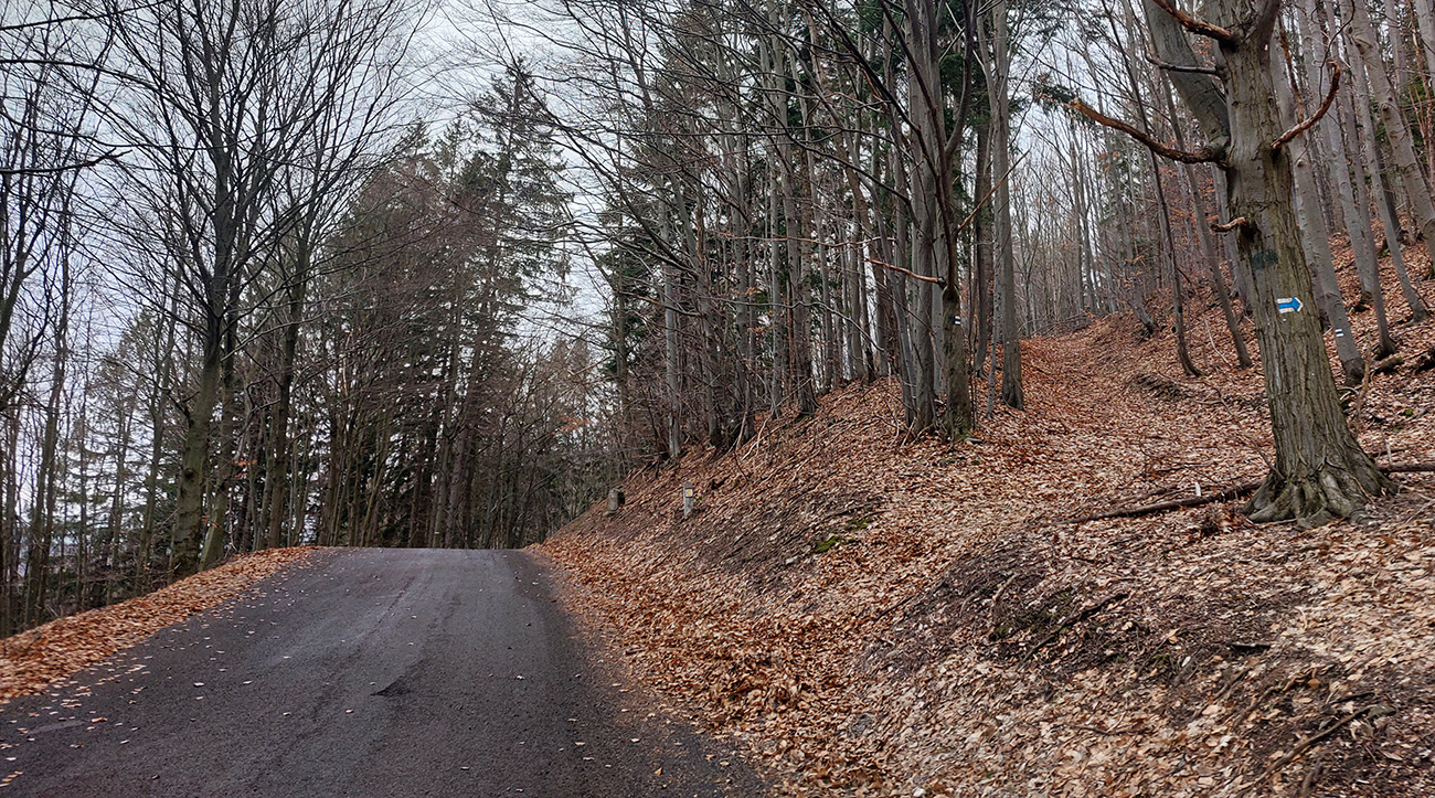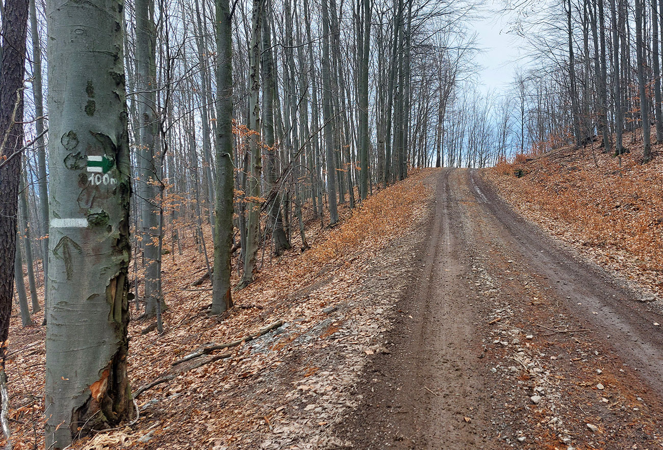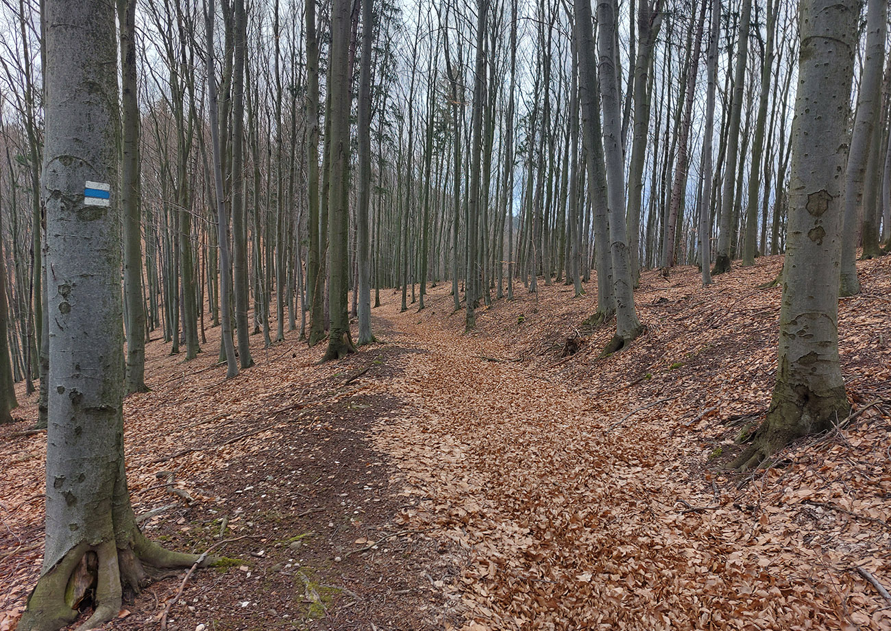 Potom na kuse cesty aj ozajstné záveje, ale z bukového lístia, niekde aj po kolená. Vietor zaniesol lístím celý výmoľ, ktorým značka vedie. To už je pre zmenu chodník – a ide paralelne s asfaltkou do Močiara. Cesta sa potom odpája doprava, do dediny, značka doľava, cez rampu a stále v klesaní, do doliny Istebného potoka. Nič extra, stále hospodárske lesy a nula výhľadov do krajiny. Sem sa oplatí prísť najviac vtedy, keď je jeseň najfarebnejšia.