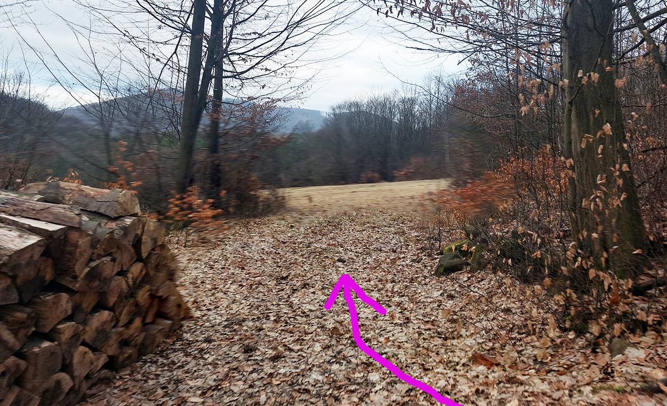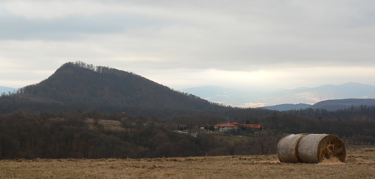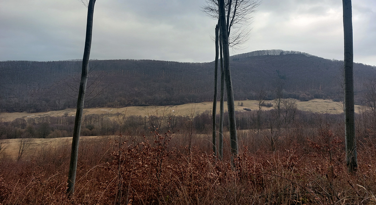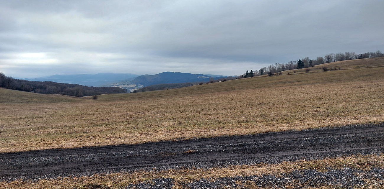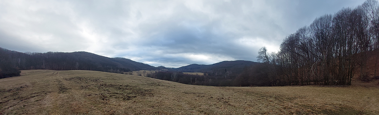 Takže som už vedel, že vlak stíham, to bol základ :-) Je to tam najskôr z lúky na lúku, lesíkmi. Jeden úsek cesty, ktorý bol predvlani totálne roztraktorovaný, teraz našťastie ok, lebo primrznutý. Výhľady sa začínali otvárať už aj na Pohronie, špicatá Suť trčala v panorámach poriadne, najmä pri pohľadoch z poslednej lúky, pred definitívnym vstupom do lesov: