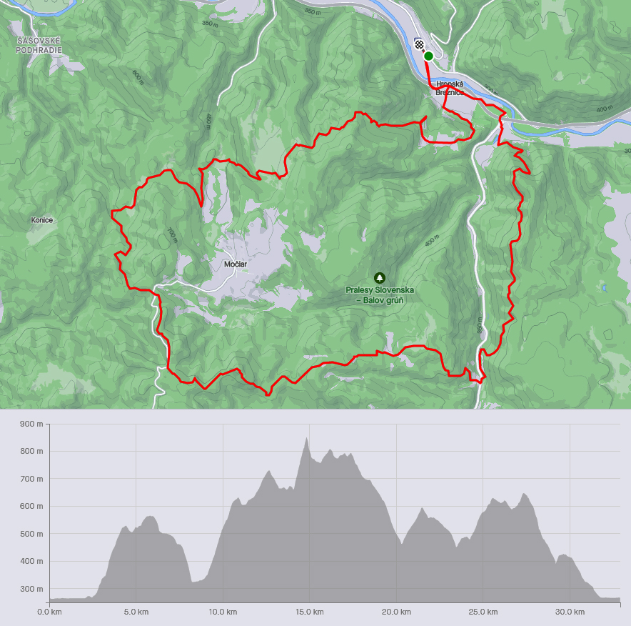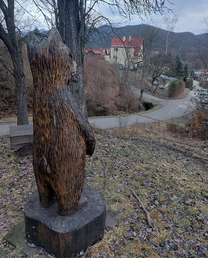 Oplatilo sa, je to krajší zostup ako lesom priamo po zelenej. Potom už len strmo dole a popri cintoríne do Hronskej Breznice. Aj medveďa som na konci obehol, ako strážil vstup do dediny. Ale asi už dosť dlho stráži, čo je taký zdrevenený :-)