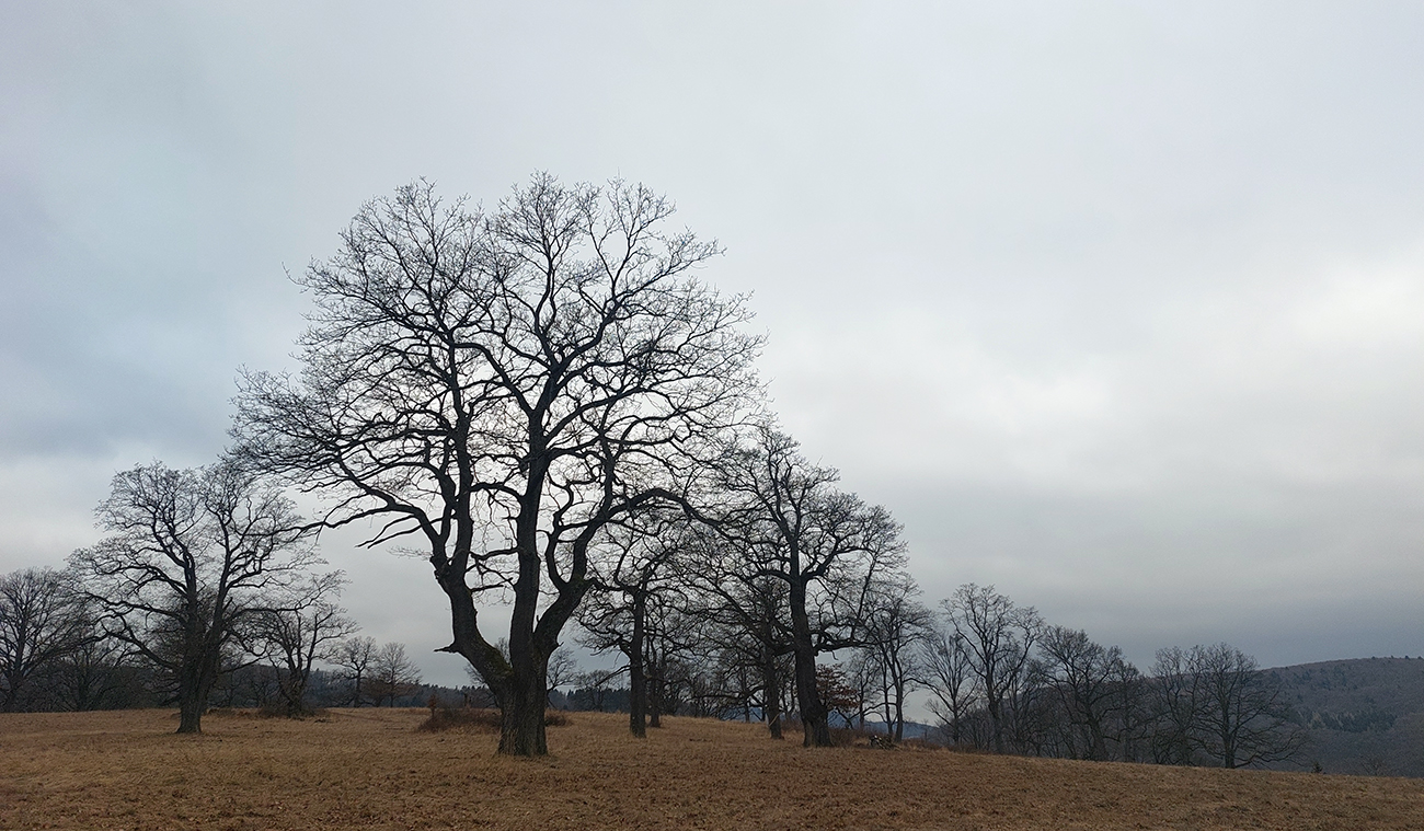 Začiatok stúpania od motorestu smerom na Rejchard (zelená značka): odparkované LKT a v potoku naťahané kmene neveštili nič dobré. Našťastie to bol len kúsok. Potom strmá, rozbitá cesta, pod vrcholom zarastajúce pasienky s krásnymi, starými, solitérnymi dubmi. Skoro ako Gavurky, len zanedbanejšie. Hore na temene krajšie, čistejšie lúky. Výhľady na východ ku Poľane a cez Pliešovskú kotlinu k Javoriu.