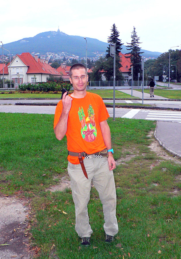 Pred štartom v Nitre: Novinkou bola prezentácia už večer. Dalo sa potom zapísať aj ráno, ale už vlani boli problémy všetko stihnúť. Teraz sa vďaka večernej prezentácii ráno všetko stihlo - zdalo sa, že celkom v pohode. Po parkovisku pobehovali za brieždenia divní panáčikovia s ruksačikmi, len jeden nemenovaný za sebou ťahal lodný kufor :-) Niektorí sa tvárili, že rozklusávajú, pritom ale hľadali čo najhustejší krík. Radov megafón išiel na plný výkon a dvojjazyčne! Chlapec mal tradične sklený pohľad, na pozdrav neodpovedal na prvý raz a potom už ten tlak zodpovednosti nevydržal a chcel sa ísť zastreliť či čo... Ale všetci išli za ním, tak si to rozmyslel, o siedmej strelil len tak do ľuftu a davy sa pohli.