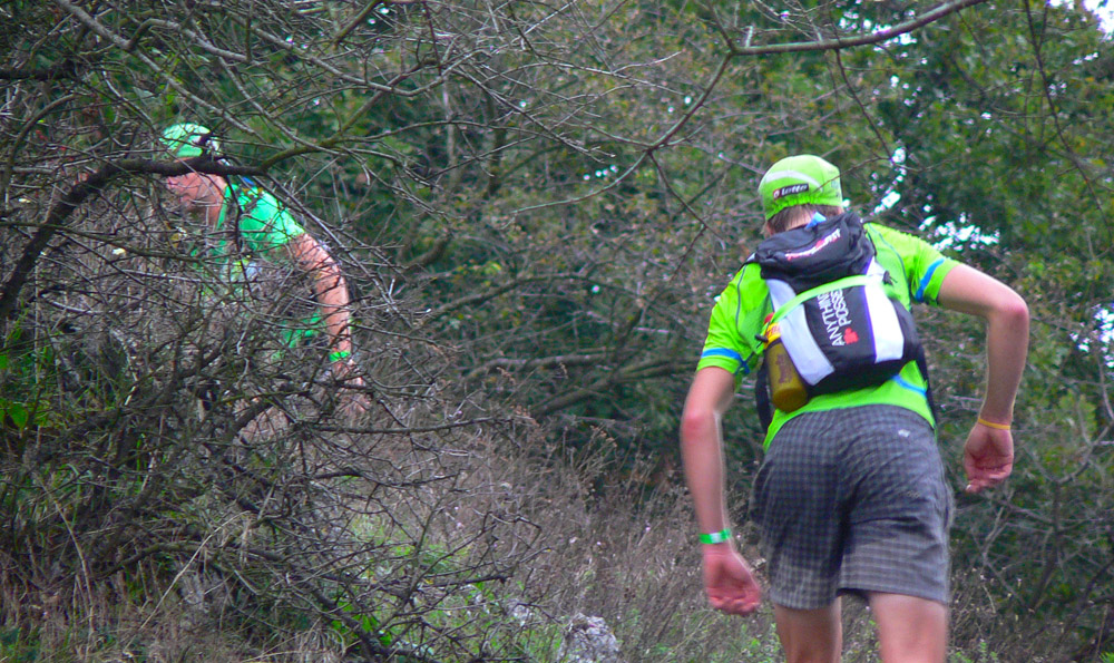 Veľké Pole - Jarabá skala: Ja sa na tento úsek naopak vždy teším - konečne budem vyššie, bude lepší vzduch, príjemne mäkko pod nohami, ožívam. Tak aj teraz. Dopujem sa pre istotu chémiou, aby sa ľahšie stúpalo na Rúbaný vrch, odkiaľ sa už dobre beží. Aj mi to celkom v tej dnešnej mizérii ide, keď zrazu sa okolo mňa preženie lokomotíva Tomáš Bizoň. Keď ja idem na Šlehu, čo si dal on??? Pod Tríbečom vyzeral biedne. Tiež opustil parťáka, ktorého vraj zradil žalúdok, a ide ako píla. O chvíľu ma ale predbieha zas: nejaký debil tam musel prehodiť fáborky náročky do zlého smeru! Uverili viacerí, Ivan Mudroň tak asi prišiel o striebro. V cieli padla myšlienka, že to bol možno krčmár zdola z dediny, aby získal klientov :-)