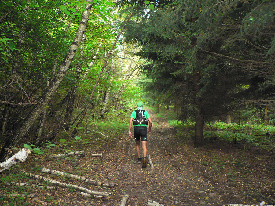 Cesta do Veľkého Poľa - tie tiene ako naprotiveň sú zas „proti predpisom“. Dole v krčme sa dozvedám, že Maťo Kais riadne ušiel Ivovi Mudroňovi (skoro pol hodinu v porovnaní s 5 minútami v Kostoľanoch) a druhá dvojka sa rozpadla - Miki Kéri kŕčuje, ak vraj niekoho neukecá na turistické tempo, končí. K9 na 72 kiláku je inak dosť zlomový bod, tu veľa ľudí končí pravidelne - stačí si predstaviť čo ich čaká ďalej s príchodom noci, stačí aj pohľad na profil trate :-)