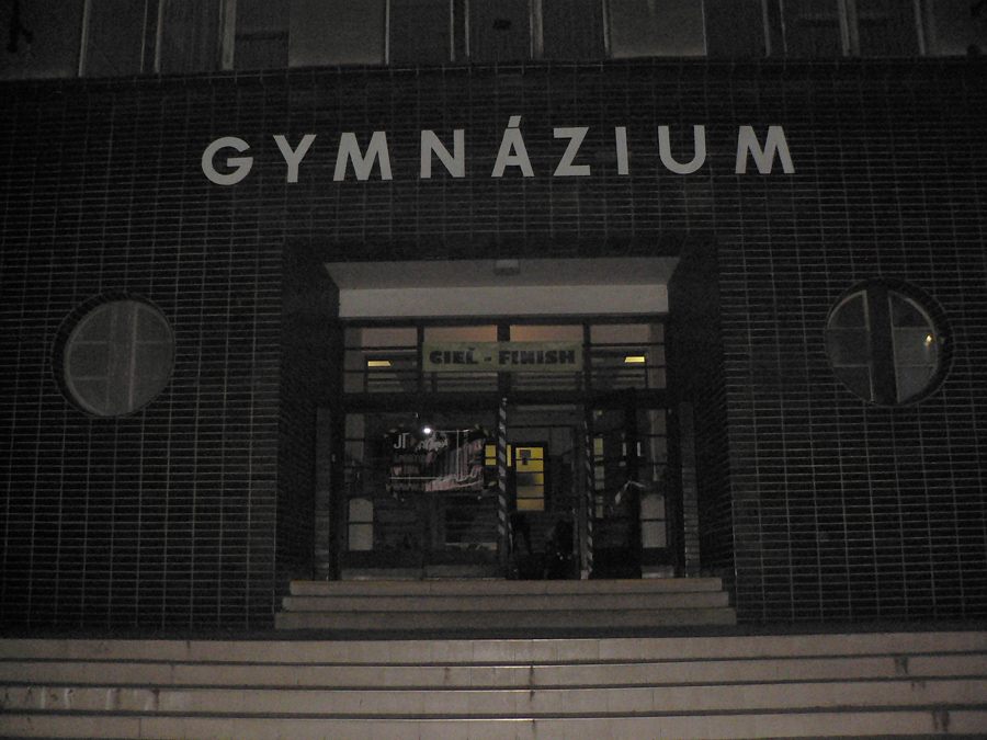 Potom síce už len nudná betónka, ale prekvapenie na koniec: zas skrátenie trate!!! Lebo ako je to na Slovensku zvykom, dohody sa nedodržujú, keď je na obzore lepší kšeft a cieľ musel byť na poslednú chvíľu presunutý. Rado priznaj, koľko šedín ti pribudlo? Inak to gymnázium, okrem toho že je bližšie, má aj nespornú výhodu, že sa tam dá osprchovať. Zombie párty sa mohla rozbehnúť!