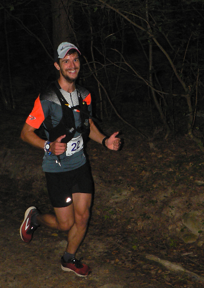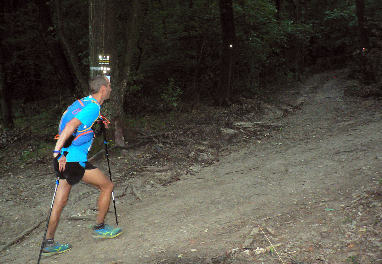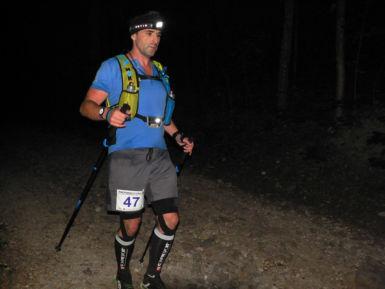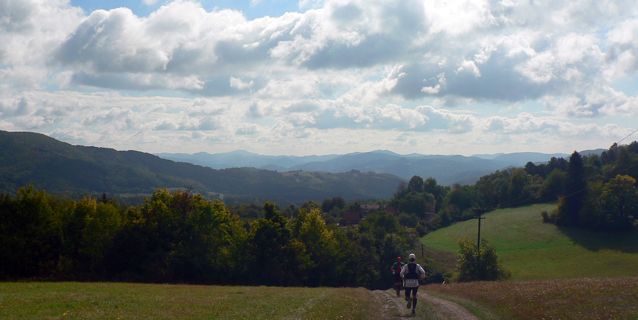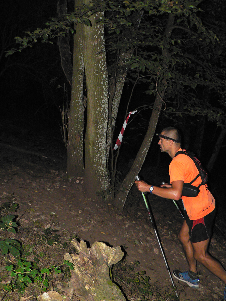 Cez kopček do Remitáže (K8) - už len s Emilom ťahám, ale okolo nás stále niekto, obetí na fotenie mám dosť. Na Remitáži smutná správa, že aj Tomáš Borčin, ďalší adept na bedňu, to tu zabalil z druhého miesta – zradilo ho koleno. Chcel si vylepšiť čas. Vlani bol tretí, no škoda. Slnko zaliezlo, tasíme čelovky a hneď máme novú tému na klebety – kto mal kedy akú :-) Do Žirian cesta vedie popri hnojisku, to mi z istých dôvodov vyhovuje, ale pod Žibricou už mám Emila zas dobehnutého a plánujem, ako si ho tam zboku nafotím, nech vidno tú strminu.