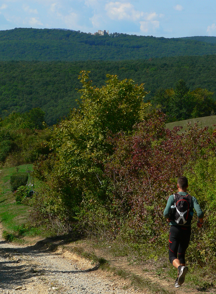 V sedle Rakyta (K6) budíme a z kresla vyháňame Petra M., ktorý klame telom a tvári sa ako vyoraná myš na vlastnom pohrebe, ale onedlho nás raketovo predbieha. Na Tríbeči nás turisti núkajú borovičkou. Vraj kto si dá, nebude potrebovať čelovku, tak mu budú oči svietiť. Strmina dole z kopca a mraky púdru vo vzduchu za každým bežcom. A už je tu K7 Jedliny, kde sa Miki K. zmenil z tajného na normálneho kontrolóra a Adam L. z bežca na ležca. Je zlatá hodinka, hrad Gýmeš a nízke slnko robia asfalt do Kostolian pod Tríbčom ľudskejším. V dedine podobne ako vlani dáky koncert či čo, duní celá dolina.