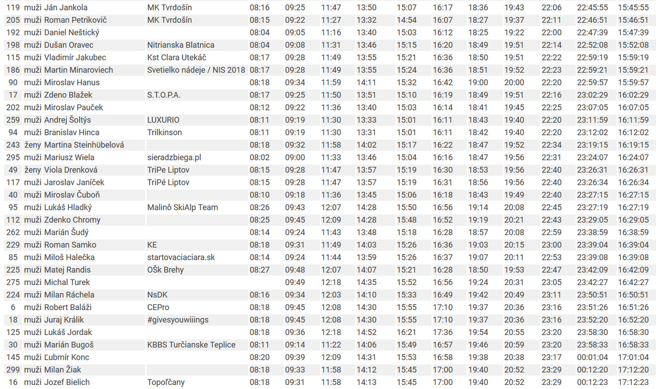 Keď som sa konečne dokodrcal až dole do cieľa, socializácia sa v jedálni už pomaly dostávala do obrátok a Wataru Iino už asi ani nevedel, že bežal. Dal to za 12 hodín (to už aj s penalizáciou 30 minút za tú chýbajúcu K2, aby sa nepovedalo). Asi tréningovo – keby niečo, vlani vyhral Badwater za 25 hodín, skoro hodinu pred druhým... To je už iná liga, mimozemská. Druhý Paťo Hrotek (12:13) - paráda na to, že vraj od Cesty SNP nič nebehal. No vieme, ufóni nebehajú, keď môžu lietať... Za ním Paľo Porubčan (12:27) a ďalší. Veteránov s prehľadom vyhral Mišo Svedek. S ním som ešte stíhal, aspoň viem, kam patrím...