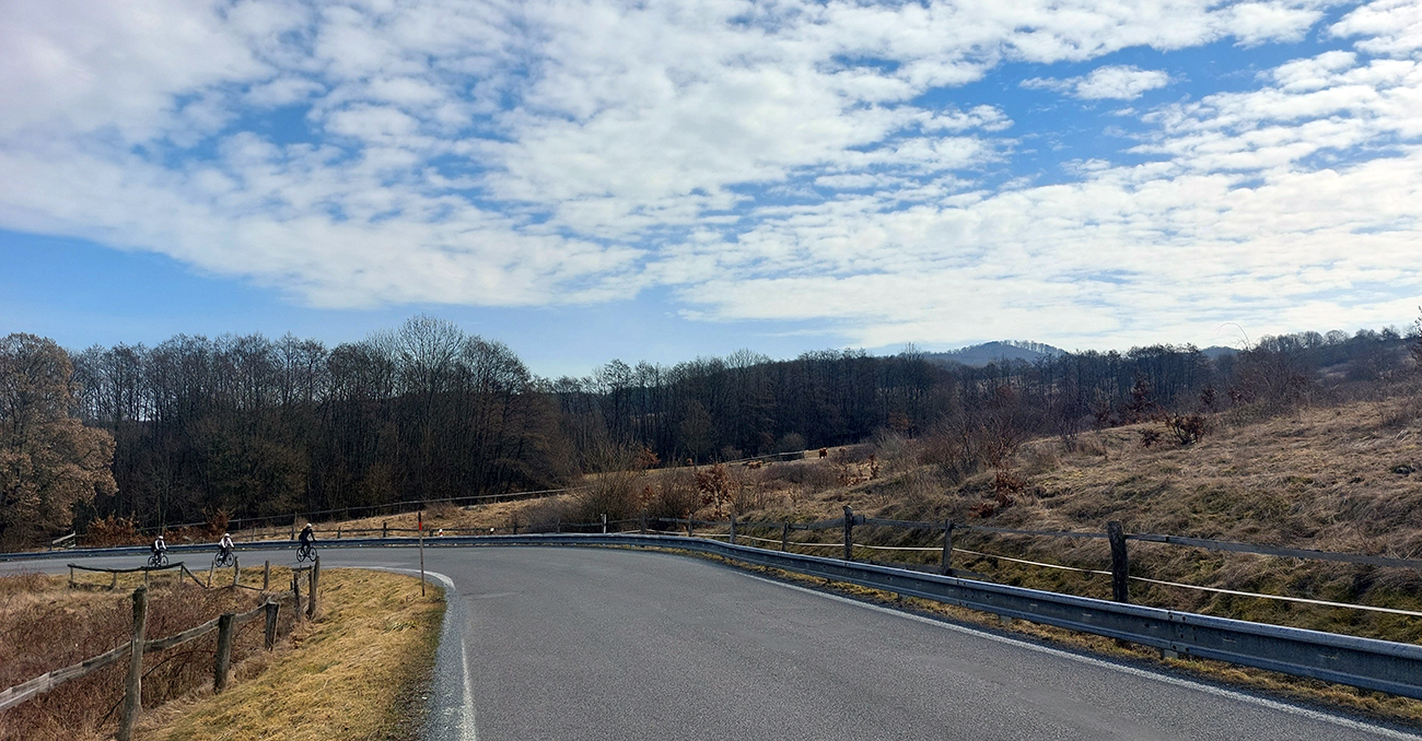 No to už som sa štveral do ostrolúckych serpentín, kde starší biomasaker už stíha dorastať, za plotmi sa pasú ofinaté kravy a otvárajú sa výhľady dozadu do kotliny. Pri jednom takom ohliadnutí som zbadal, že ma dobieha skupinka žiletkárov – skoro som neveril, nik na elektrike :-) A vraj ich v Detve začalo zo 50, len sa cestou roztratili. Tak tomu sa povie komunitný výjazd!