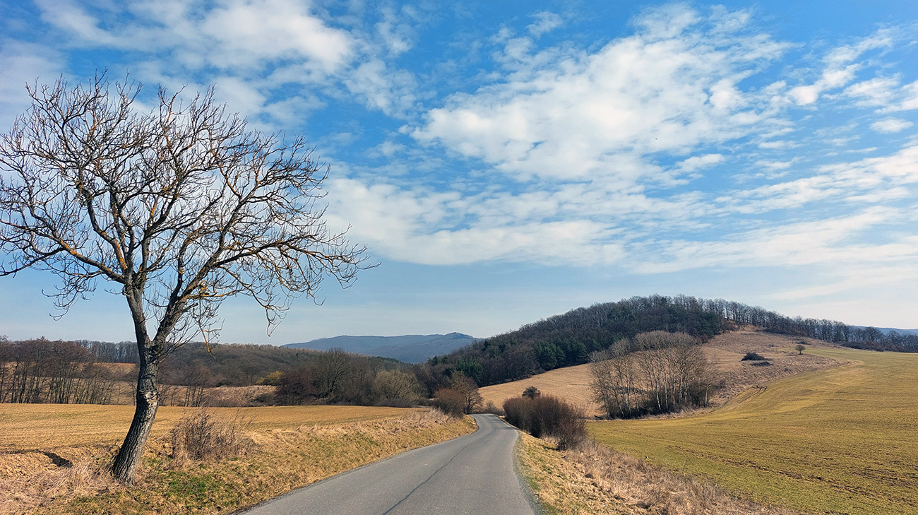 Víkend, počas ktorého fičala prvá ultrabežecká stovka v sezóne u nás (Letecká) bol hriešne suchý a teplotne príjemný, nedalo sa odolať – vytiahnuť cesťák na dlhší výjazd :-) Keď už som sa na Leteckú v nutnom veľkom predstihu neprihlásil s nádejou, že budem ešte lyže drať. A nie, že by som Pino už predtým párkrát nevyvenčil, ale to len okolo domu, tak nadišiel čas aj inde sa pozrieť. A že mám ten týždenník na vlak, odviezol som sa do BB a odtiaľ už po vlastnej osi obzerať kopčeky okolo Hrona na západ od Zvolena. Takže tých prvých a posledných 20 km si netreba všímať, to dôležité je v sľučkách na mape v okolí Budče, Tŕnia, Železnej Breznice, Hronskej Dúbravy, Ostrej Lúky, Brezín, Bacúrova a Dubového. Krajina pekná, aj keď ešte predjarne sivá, ale výhľady cykloturisticky pozitívne a asfalty fajnové, tak som sa ani nedivil, že som tam nebol sám: