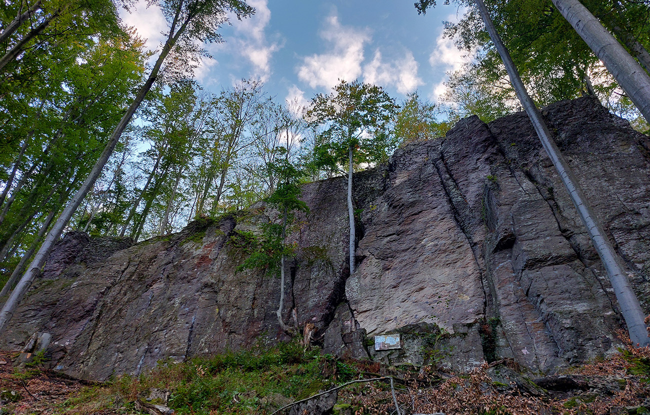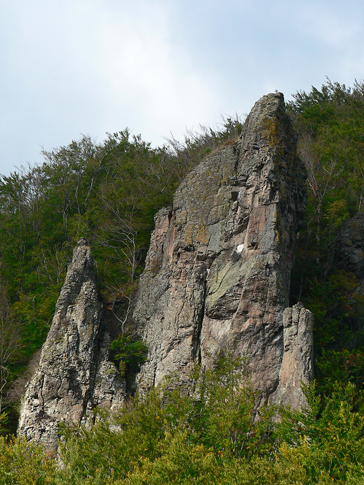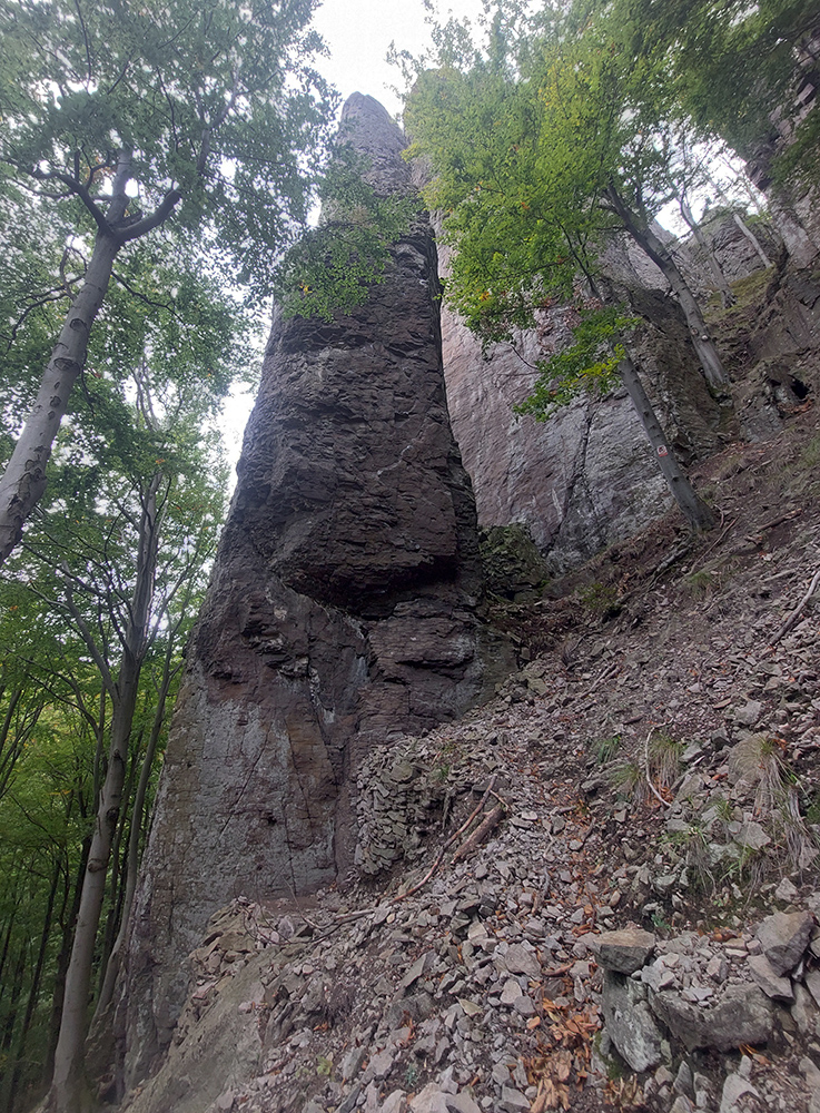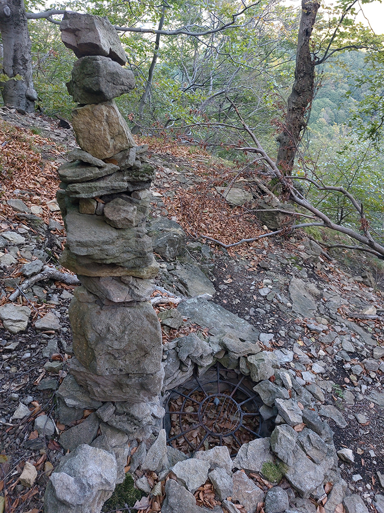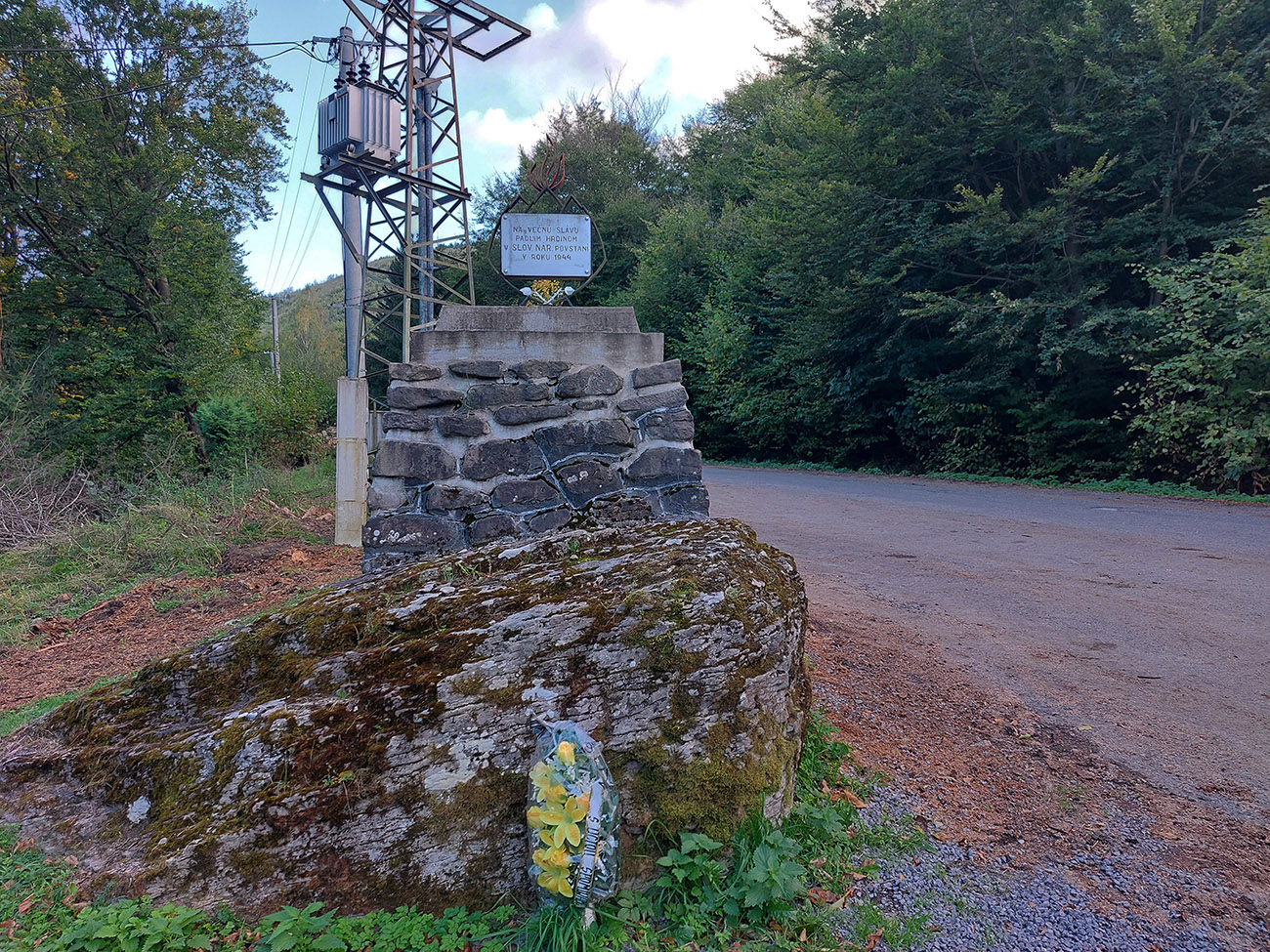 Ďalší na rade bol sektor Nad bunkrom - ešte kúštik vyššie do doliny, rovnako zreteľná šípka, tentokrát doprava cez potok a strmá chvíľa po chodníku lemovanom mužíkmi, až pod steny. Na pohľad trochu iná štruktúra toho andezitu, zdalo sa mi, ale rovnako príjemný chodník popod skaly. Nezišli sme popod ne až dolu na parkovisko, ale tesne pred sme odbočili - obzrieť zrekonštruovaný bunker a partizánsku nemocnicu (tiež taký bunker). Po žltej turistickej značke sme potom zišli k autu. Na skalách nad bunkrom je síce nakreslená vyhliadka, na tú sme už ale akosi pozabudli, lebo nás čakal zlatý klinec programu.