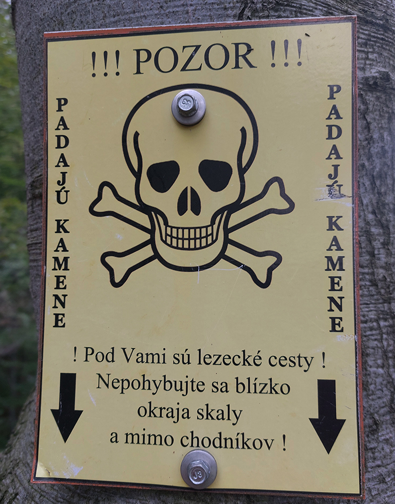 Cesta jasná, z dediny aj otabuľkovaná, nad dedinou nový asfalt, aj keď len taký ochotnícky, hojdavý. Zapichli sme to pri chate Smrečina, ktorá po vlaňajšom výbuchu už vyzerá znovu vo forme. Vtedy sa to našťastie zaobišlo bez obetí. Teraz však nejaké ťažšie ujmy hrozili – na lezeckej cti, podľa toho, čo som počúval cestou z parkoviska. Tak som radšej partiu nechal tak a išiel po svojom. Keď som ich po vyše troch hodinách neomylne našiel podľa nadávania na hnusnú zimu, akurát doliezali vari piatu cestu v sektore Radegast. Prístup? Jednoduchý aj pre neznalého: pri chate smerovník so žltými, novými tabuľkami (tá fotka vyššie). Ešte kúsok hore dolinou, rovnako nová tabuľka smerujúca do strmého svahu vľavo a pomedzi stromy už presvitajú skaly. Prehliadka sa dá zokruhovať popod skaly nazad ku chate, so zachádzkou strmo hore pomedzi skalné veže (A tie sú tu teda grandiózne!) na Jitkinu vyhliadku. Trochu som tam poležal v lístí, popočúval občasné nadávanie, ktorému som úplne rozumel, a častejší lezecký žargón, ktorému som takmer nerozumel, trochu som poprovokoval, a keď ich to konečne prestalo baviť, išli sme sa ohriať chôdzou a obzrieť, čo je nové v ostatných sektoroch.