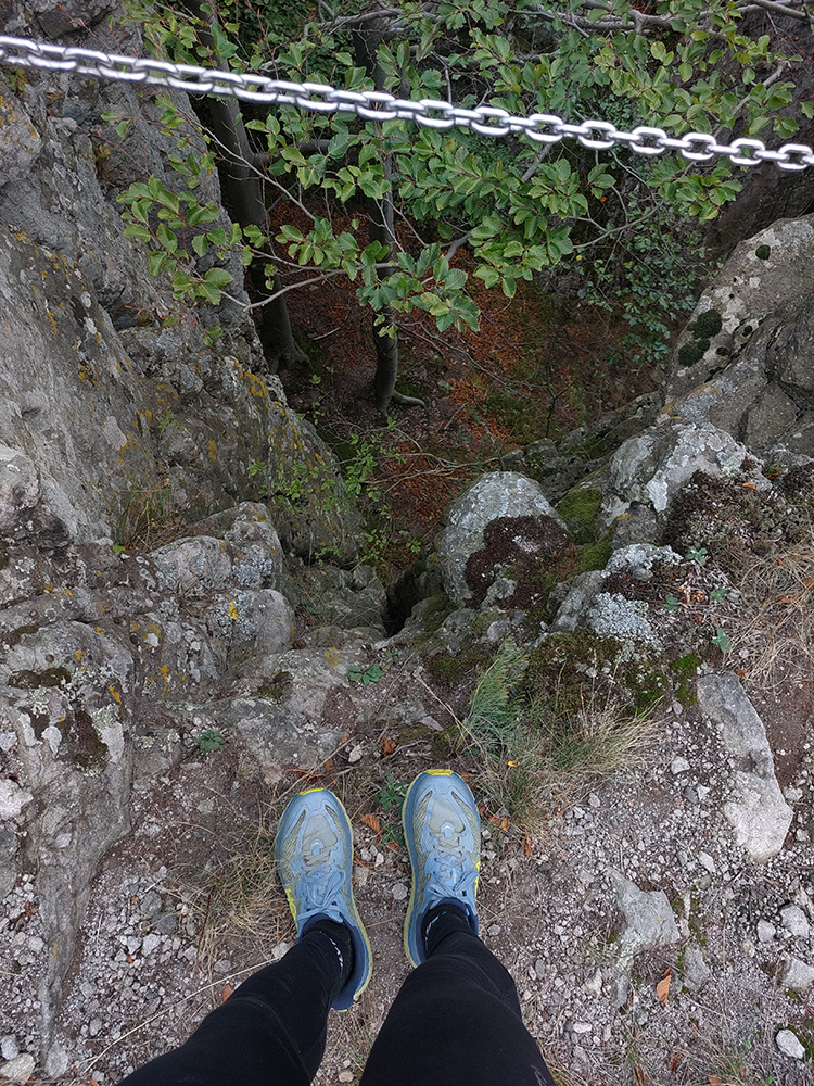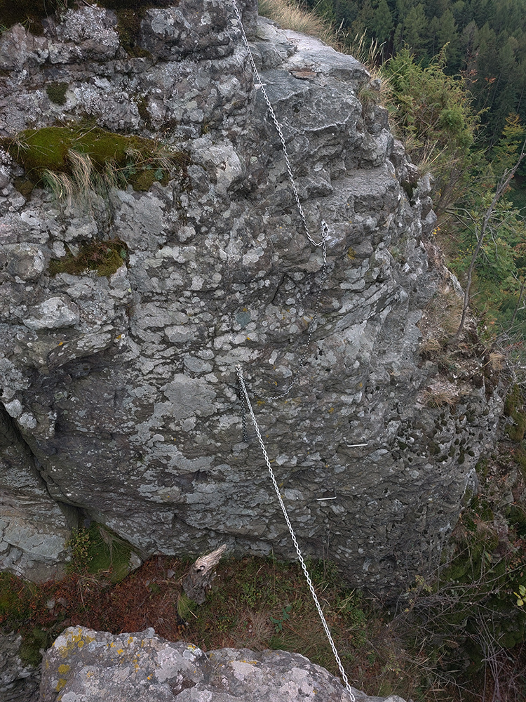 Znovu sme poobzerali nástupy do ciest a miestne skalky aj infotabuľky k nim a tým zlatým klincom sa stal výhľad z jednej z veží, na ktorú miestni správcovia vytiahli krásnu feratku. Asi 200 m, ale poriadne strmých a členitých. Nie lanom, ale reťazou zaistených. Plus pár kramlí a schodíkov, úplná paráda pre zdatnejšieho turistu. Výhľad do kotliny aj na protiľahlú Jitkinu vyhliadku a nižšie v pohorí z lesa trčiace skalky. Ozaj pekný kút krajiny, pritom zdola to vyzerá ako samý les. Ale aj vyššie v doline je kadejakých skaliek a vežičiek ešte dosť, je tam čo objavovať. Ale to už sa tiene predlžovali a dýchala z nich zima, tak pomaly rýchlo dolu a davaj domov. Hádam zas niekedy ešte...