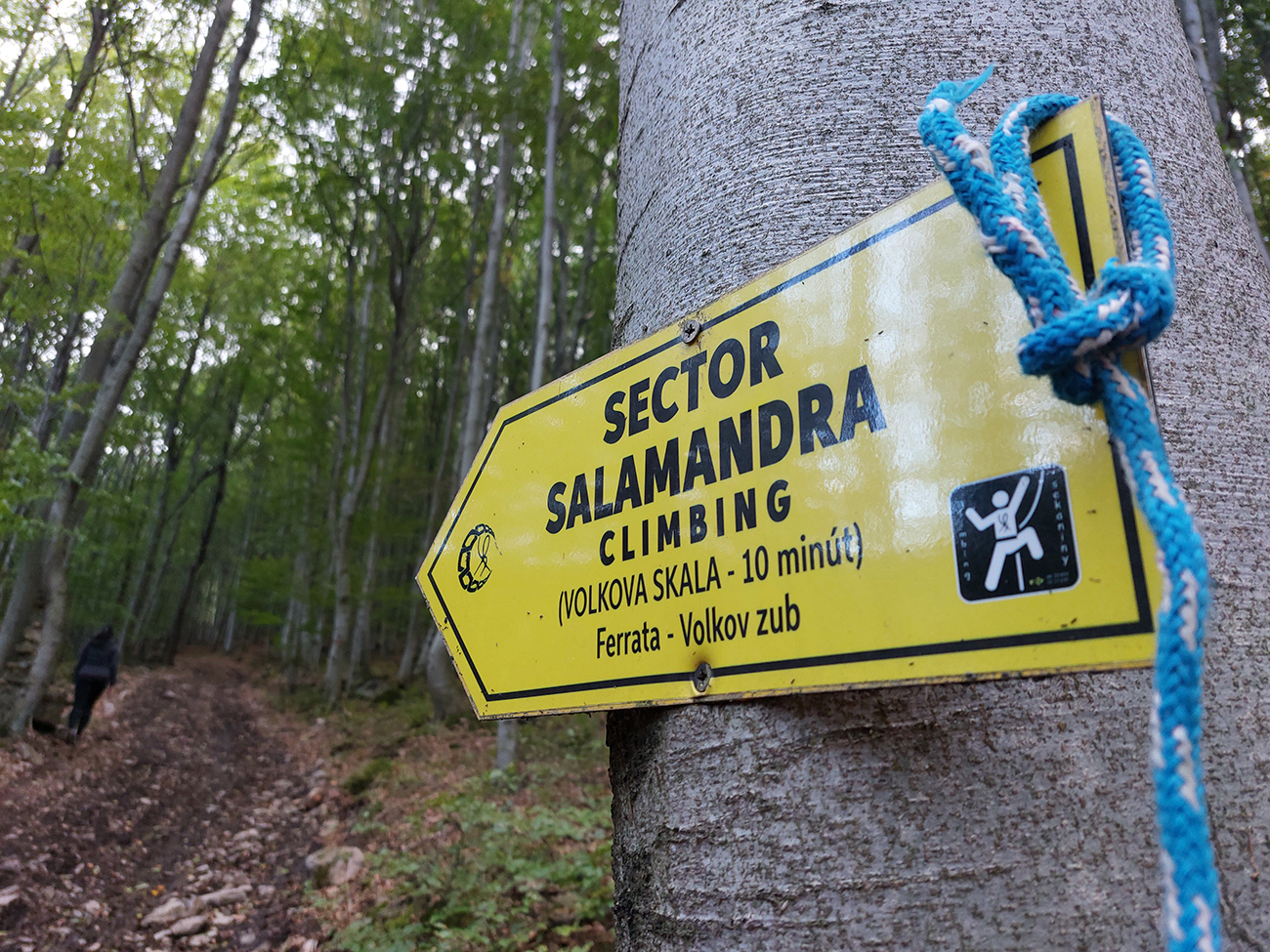 K tomu sme sa prepracovali z nižšieho parkoviska, ktoré je pod amfiteátrom. Nástup pod pôvodný, prvý sektor Salamandra viedol zrejme ešte nedávno po krásnej lesnej ceste, lemovanej poriadne veľkými skalnými mužíkmi. Takmer všetko to ale padlo za obeť vyčíňaniu ťažobnej techniky, tak len treba dúfať, že jazvy sa čoskoro zahoja. Akurát tieň dospelých stromov nebude na pár miestach ešte desaťročia. Toľko k tej výnimke.
