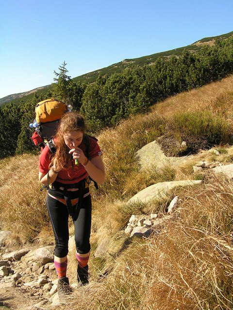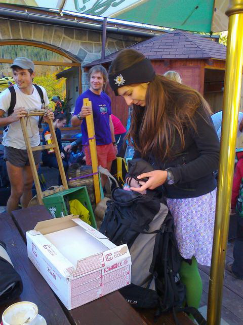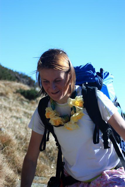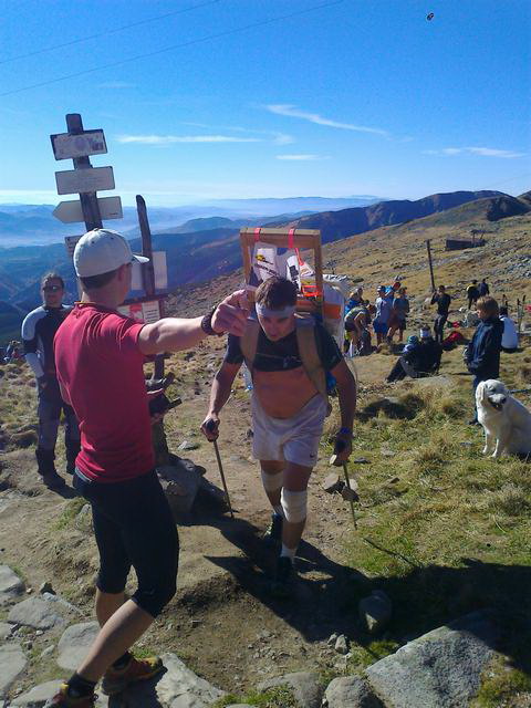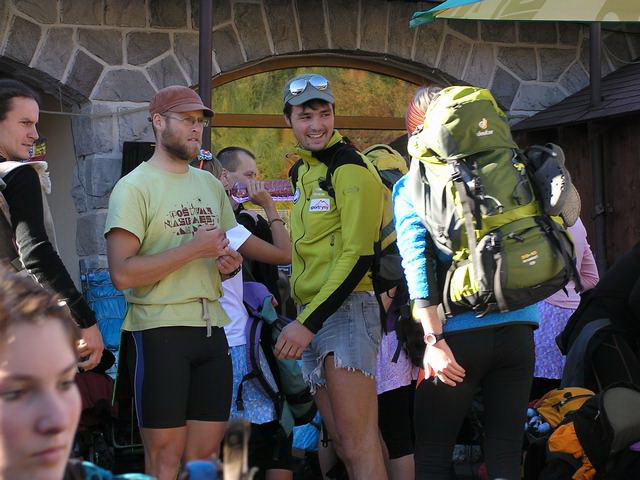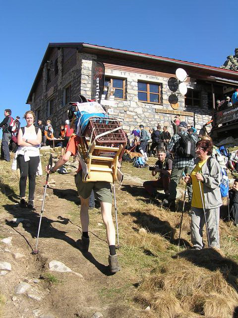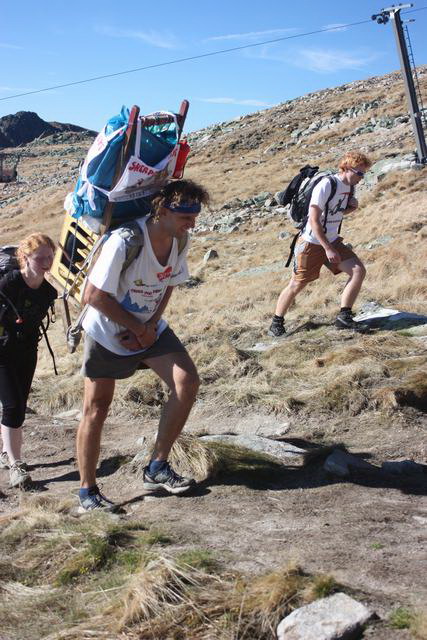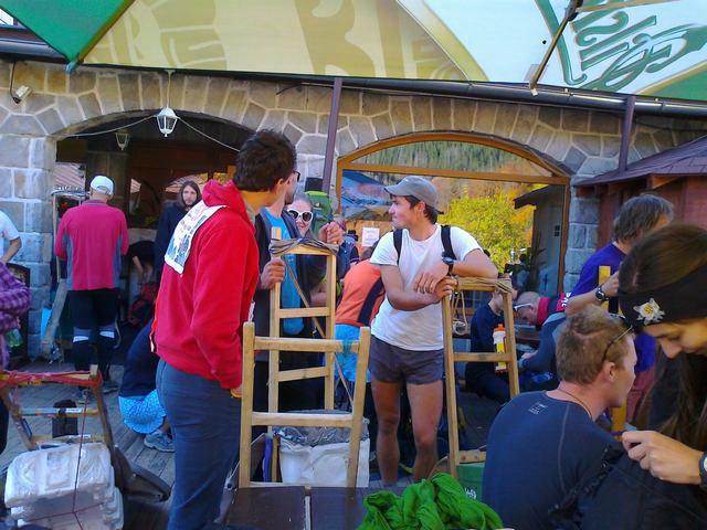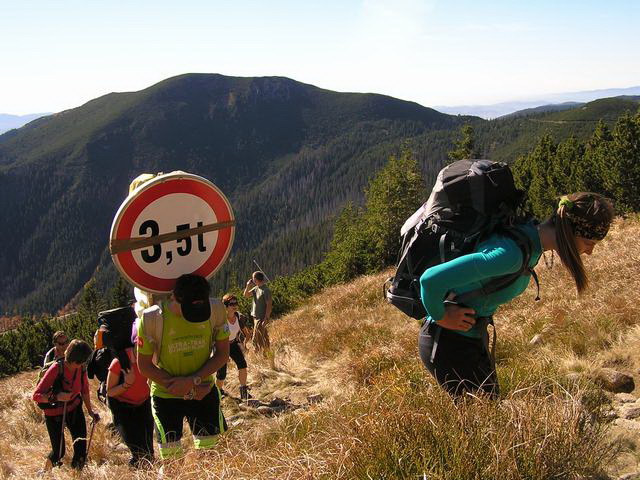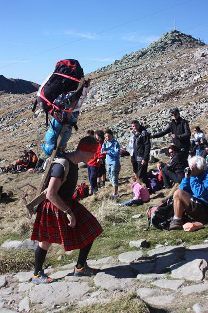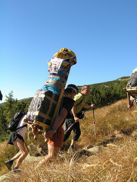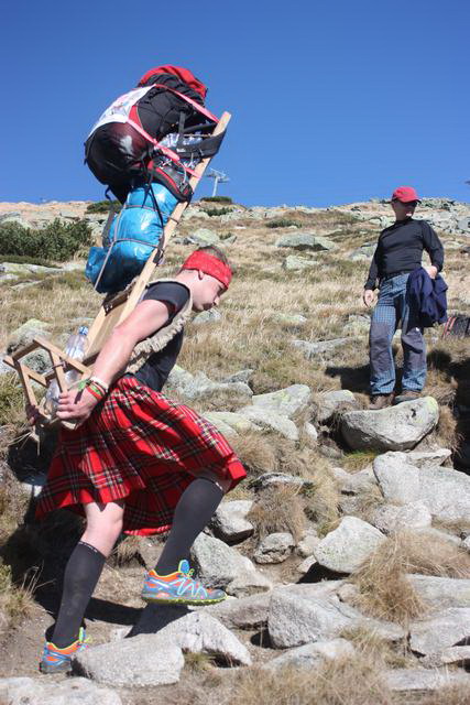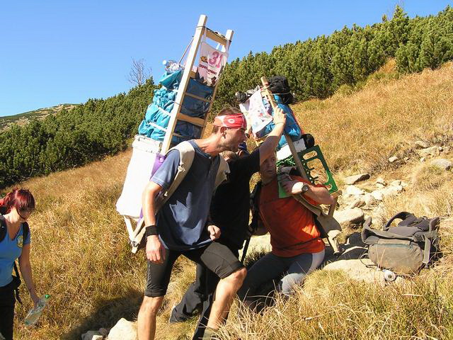 45 Sherpov a 25 Sherpkýň sa pustilo s chuťou do nie až tak chutného kopca - smer Kamienka. Trať viedla serpentínkami cez les a potom malebným rozkopaným staveniskom popri hoteli Kosodrevina. Odtiaľ už začínal nosičský mordor - hore turistickou cestou po veľkých kameňoch a so slnkom, pražiacim do chrbta. Príbeh "Ide ťava Saharou" nemal konca, ale nakoniec sa šťastne skončil a všetci dorazili do cieľa. Aj keď samozrejme každý v inom rozpoložení a inom čase. Bolo aj veľa "taktikov" z radov šerpov, úmyselne sa šetriacich na večernú Šerpa šou. A tak sa vraj našli aj takí, čo to šli na 54 štandov :-)) Čo sa výsledkov týka - presné časy a umiestnenia nie sú známe, nakoľko tvor za to zodpovedný zdrhol hneď po vyhlásení nevedno kam :-((( Vraj sa šiel voziť na vrtuľníku. Takže ak - tak dodatočne doplníme.