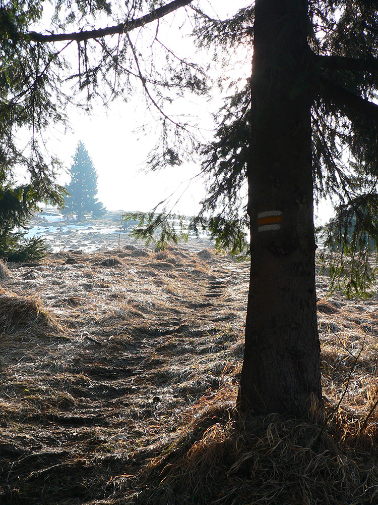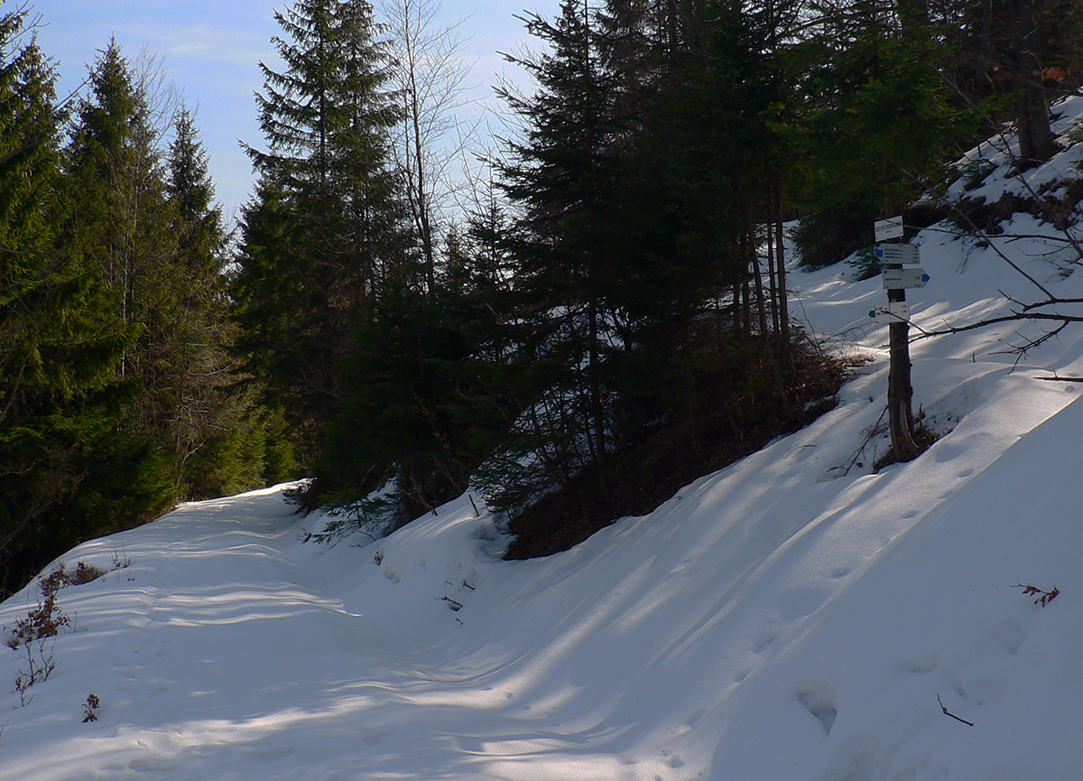 Nemal, nemal, ale nastal, no nie orientačný. Po odbočke z doliny do západných svahov ešte pohoda, po snehu ani chýru aj okolo tisícmetrovej vrstevnice. Nad chatou Plesnivá sa aj sklon upokojuje, tak aj dáke tie kalórie dopĺňam... A dobre robím, lebo ako sa cesta točí na severné svahy, zrazu stojím do pol lýtok v mokrom firne. A jeho hĺbka čím ďalej, tým väčšia. Staré stopy vedú po povrchu – hej, to keď to tu bolo na kameň, ale dnes už je „hlboká“ jar, sakra! Ani do medvedích stôp stúpať nepomáha, ani okrajom cesty sa predierať, za sedlom pod Červeným grúňom už som v tom po kolená – každý druhý, tretí krok. Nadávam potkýnajúc sa, potkýnam sa nadávajúc, až do Bystrej doliny ku smerovníku „Na jame“. A kúsok pod smerovníkom už zase pohoda a takmer sucho. Toto musela byť nejaká lokálna meteorologická zákernosť! Našťastie boty to zvládli s prehľadom, nohy v suchu.
