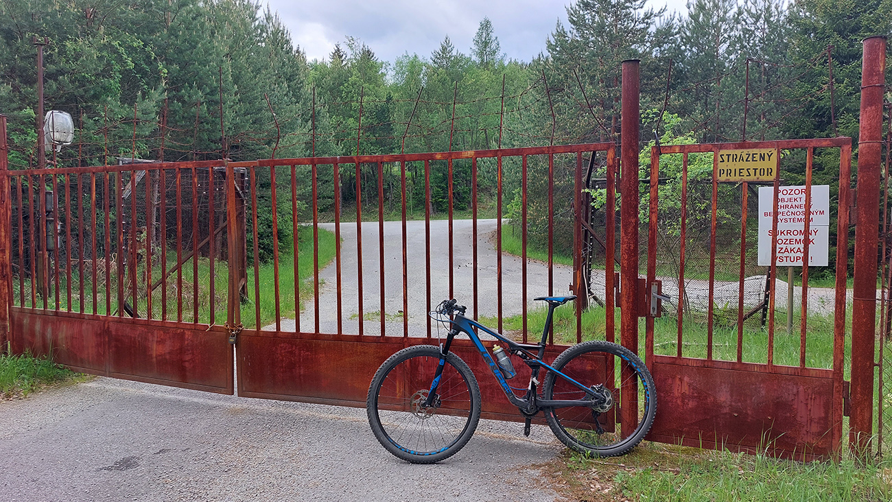 Za Bralovou skalou ešte krátko z kopca popri chate na vrchu nedostavanej zjazdovky a čakal ma naj-naj rébus dňa – lebo som potreboval podísť nejazditeľnú strminu stúpania na Kozie chrbty a zarastený zostup z Vysokej. Cestný obchvat viem, že tam je, aj na mape som ho videl, ale ešte som tade nešiel. No keď som presne na plánovanej odbočke z červenej videl nastavaných protitankových ježkov, už som tušil, že pre bajk to zjazdné bude :-) A aj bolo: parádna lesná cesta a potom dolinová asfaltko-makadamka Rovnou dolinou až hore na okraj lúk Kunešovskej planiny. Prítomnosť vojenskej infraštruktúry všadeprítomná: