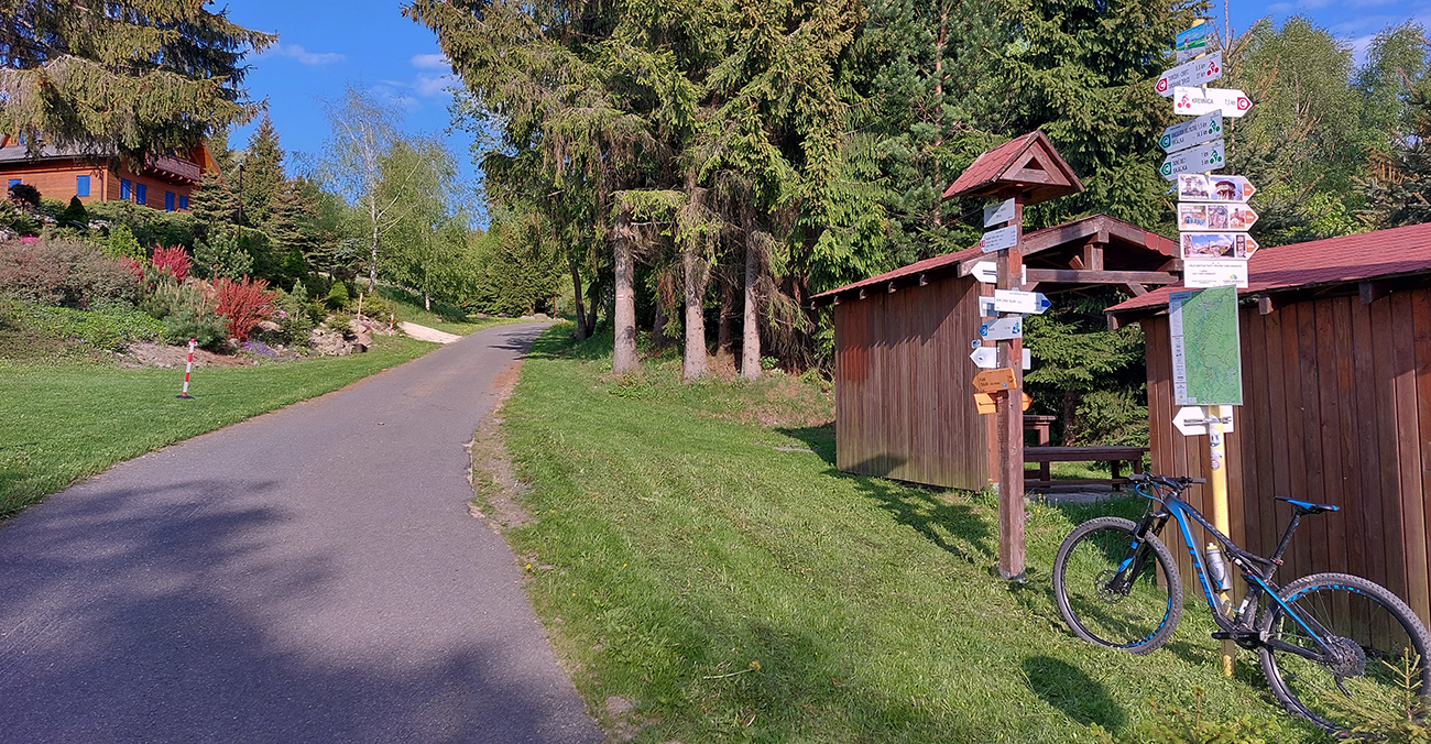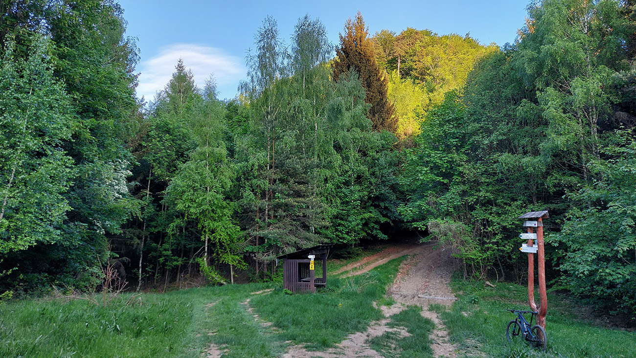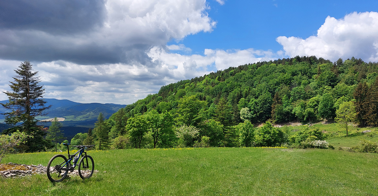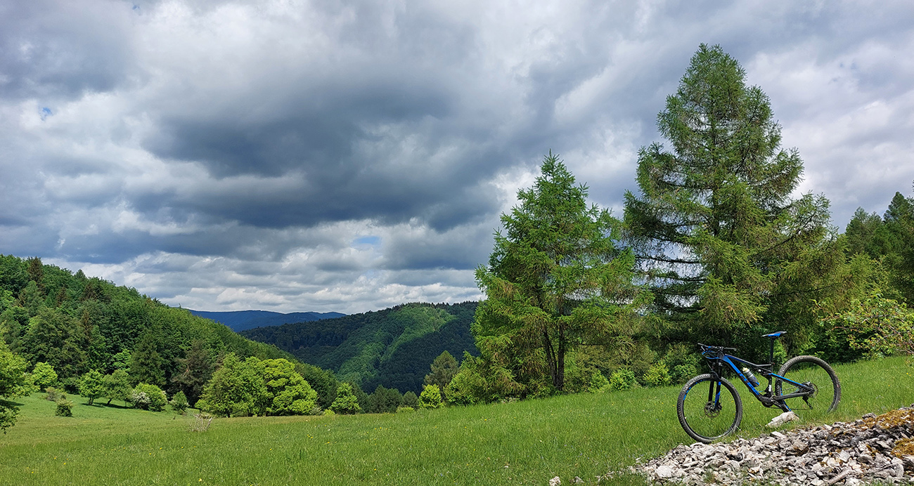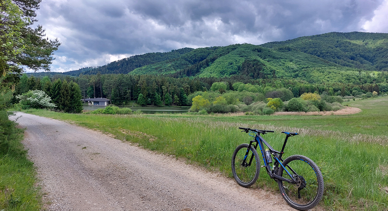 Kunešovská planina je krásny, lúčnatý kus krajiny so známym smerovníkom v strede „pokračuj 1 km krížom cez lúku“, ktorý najmä v noci alebo za hmly dokáže dobre zamotať človeka. Ale cesty tu sú, tak som si najskôr dal severný obchvat Kunešova cez družstvo a potom južný obchvat asfaltky do Kremnických Baní. Mapy pomohli, a aj dvaja miestni ebajkeri, ktorí to tu dobre poznajú. Vďaka za tipy!