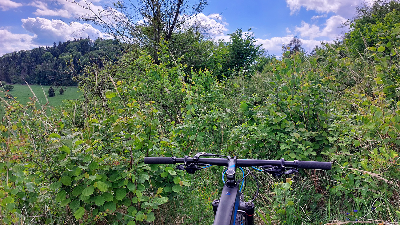 Pretože som sa snažil čo najviac vyhnúť asfaltu, nezletel som pod Vyšehradom zo sedla dole do Jasenova po ceste, ale spučil som sa po červenej – prudko hore až pod les, a potom zas po zelenej prudko dole. Všetko okolo ohradených pasienkov. Len sa mi nechcelo drahocennú výšku príliš strácať a som to trochu prekaučoval – príliš skoro som odbočil doprava, zlákala ma zjazdná lúka a viditeľná cesta. No skončil som v kroví (odroda Fredy Krueger) a na tú správnu cestu na „nižšom poschodí“ som musel bajk trochu zniesť. Tu je spätný pohľad na zvyšky hradu aj s tou divočinou pod ním: