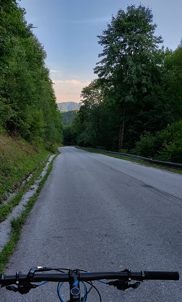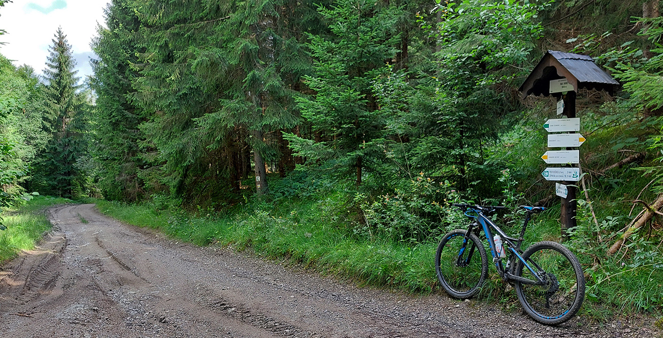 Zo sedla Príslop kratučký dolekopec na zvážnicu, ktorou sa dá dostať dole na dno Ľubochnianskej doliny. Najprv pár metrov pohodlne lesným priesekom, bajkeri poznajú, ešte aj šípka je na strome. Potom pár metrov strmo, ale jazditeľne. Pre istotu som ale zniesol, predsa len – veľké skaly, konáre, medzi nimi slizká hlina a ja biedny technik. Nikam som sa nehnal. Dole na ceste dve možnosti: doprava aj doľava. Obe ústia nižšie v bočnej dolinke, na starej asfaltke pri Tureckom potoku a k horárni Salatín je to potom už rýchly a rovný zjazd. Tu by sa pýtalo vyznačiť cyklotrasu, bolo by to parádne prepojenie Turca a Liptova.