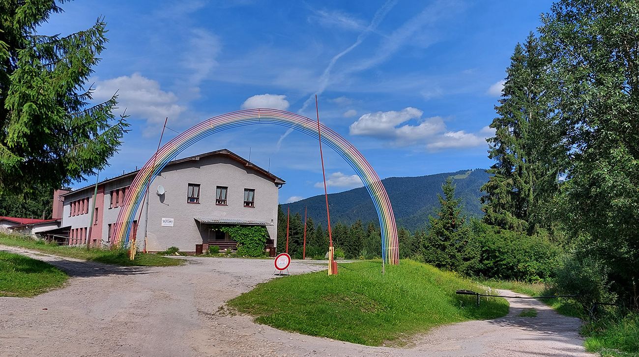 No a pod Vlkolíncom, od križovatky v Trlenskej doline, nasledovali pokusy o obchádzanie hlavnej cesty E77. Možnosti tu sú, tá v mojom smere najlepšia je zelená cyklotrasa 5422. Najprv peknou dolinou, potom príjemný tieň v lese, v druhej polovici aj rúbaniská a cez ne spätné pohľady k Sidorovu s Vlkolíncom. Nad Nižným Matejkovom sa cykloznačka síce točí nazad na sever, smerom na Jazierce, ale po východe z lesa mi stačilo len odbočiť po lúkach doprava a lúčna cesta ma zviedla, kam som potreboval. Síce som musel pár metrov prežiť aj na krajnici hlavnej cesty (krátky kultúrny šok hehehe), ale z Nižného do Vyšného Matejkova už príjemnejšie po lúkach, po červenej značke až ku známej kolibe Bodega.