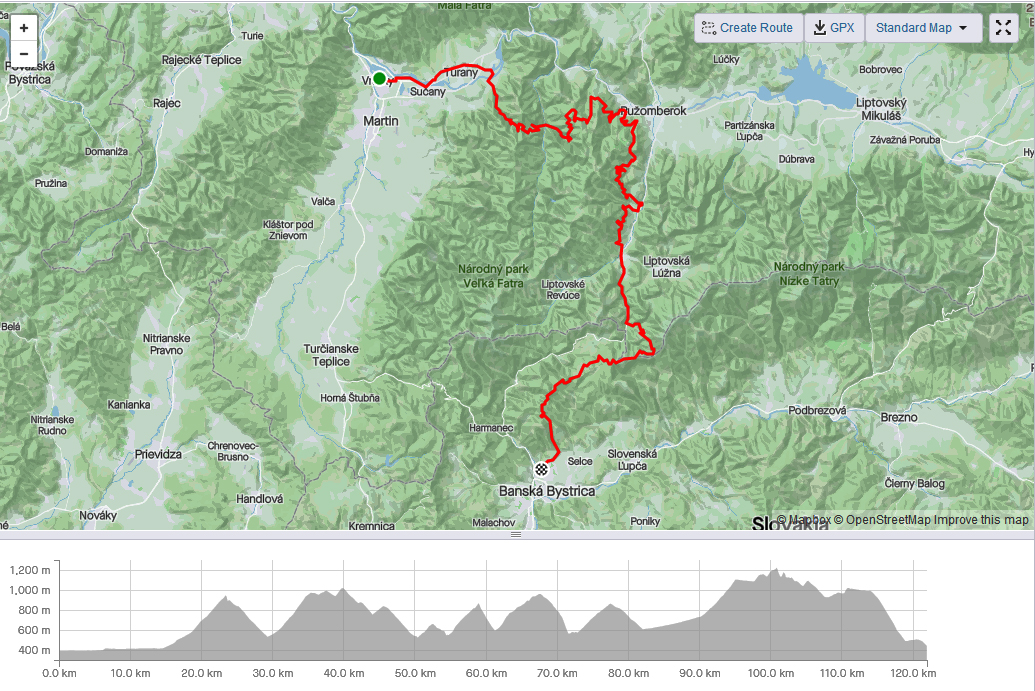 Taký malý, súkromný mtb maratónik: hodinky Coros Apex mi napočítali nejakých 122 km a takmer 3300 m do kopca. Ale o to až tak nešlo – skôr o to, že som potreboval horský bajk do BB odvliecť a konečne raz som sa nemusel ponáhľať vlakom. Lebo medzi Vrútkami a Bystricou sa pohybujem na cesťáku často, sem - tam aj peši prebehnem po hrebeni Veľkej Fatry, ale na horskom bajku som ešte nešiel. Tak som v rámci perspektívnej prípravy už dlhšie hľadal, kade by sa dalo - a našiel som takúto možnosť. Prevažne po cyklotrasách, takmer úplne som sa vyhol hlavným cestám aj asfaltkám. Dali by sa aj viac tie asfalty obabrať, najmä za Liptovskou Osadou, ale už nebol čas. Lebo ranný chládok ma odradil a pohol som sa neskôr ako som plánoval, asi o hodinku. A tiež dva defekty ma trochu zabrzdili v rozlete :-) Ale s tým sa musí rátať, no nie?