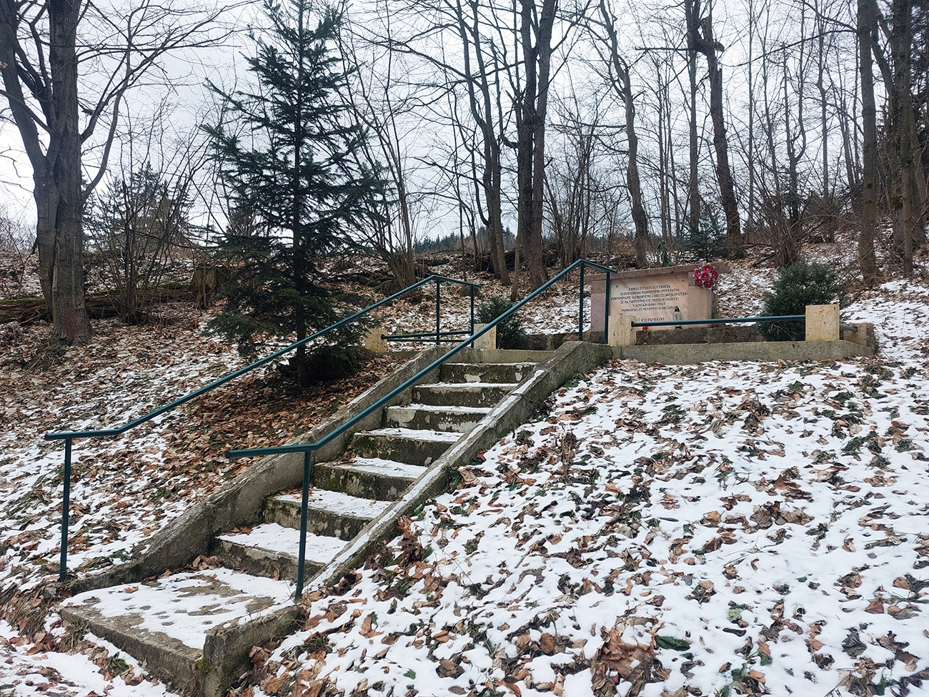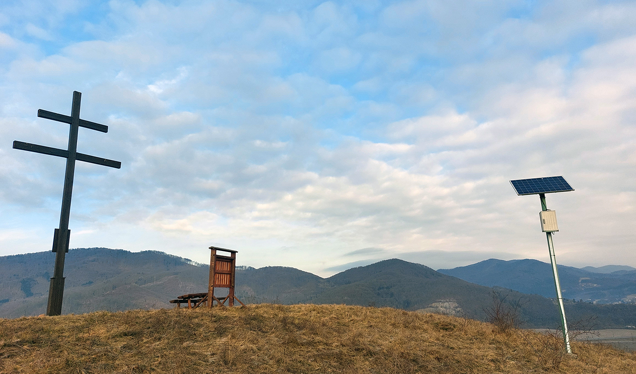 Na začiatok sme obabrali červenú značku a asfalt, k jubilejnému krížu nad Voznicou sme sa prepracovali skratkou cez pasienky. Zhora sa nám otvoril výhľad okrem doliny Hrona aj na prvý unikát: areál, kde ústi stará Voznická dedičná štôlňa. Vo svojej dobe to bolo najdlhšie banské dielo na svete (takmer 17 km). V podstate podzemná skratka priamo do Štiavnice: