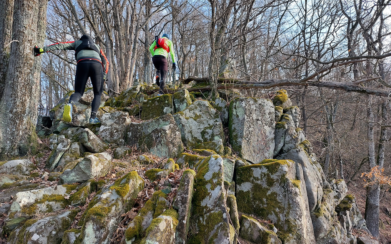 Ďalší úsek nebol veľmi o behaní, lebo v ceste stál Kojatín – najprv poriadne strmý smerom hore (čo bolo fajn na zahriatie), potom poriadne hrboľatý, alebo spestrený „preliezkami“. Skalky sviežo zelené, machom obrastené, občas nejaký priehľad pomedzi stromy: