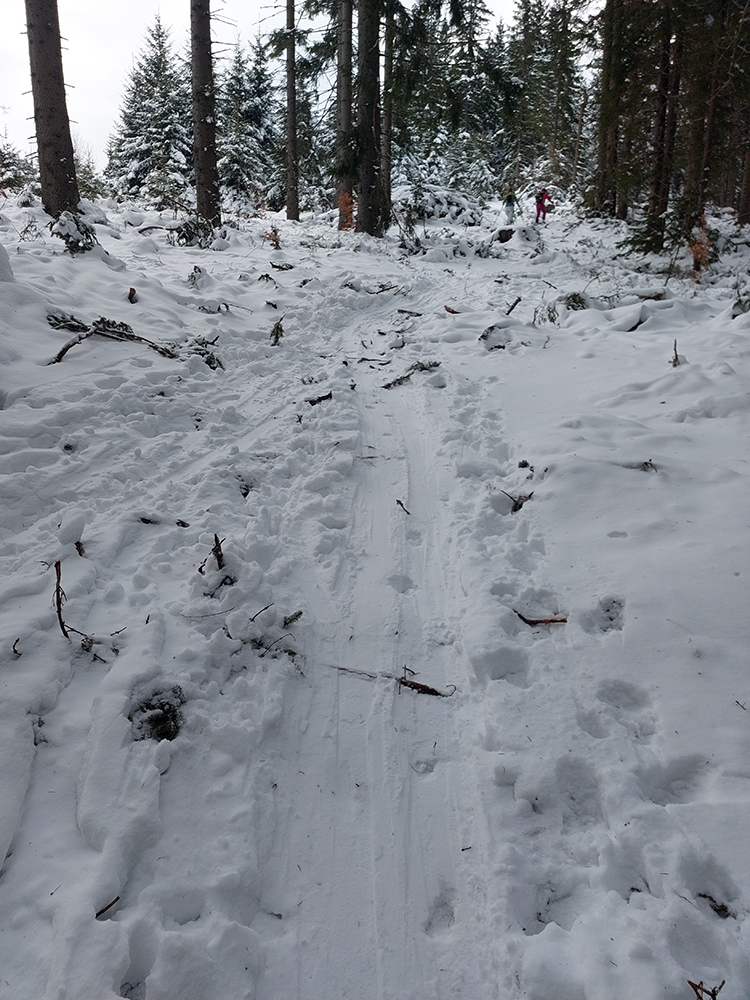 Cez lúky popri chalupách, lesom popri napájadlách a cez horný okraj Dlhej lúky až do sedla Prašivé všetko v pohode, ale na túto nadmorskú výšku ozaj žalostne málo snehu. Kľúčové sú napájadlá, ale dá sa cez ne opatrne prejsť „suchým pásom“.