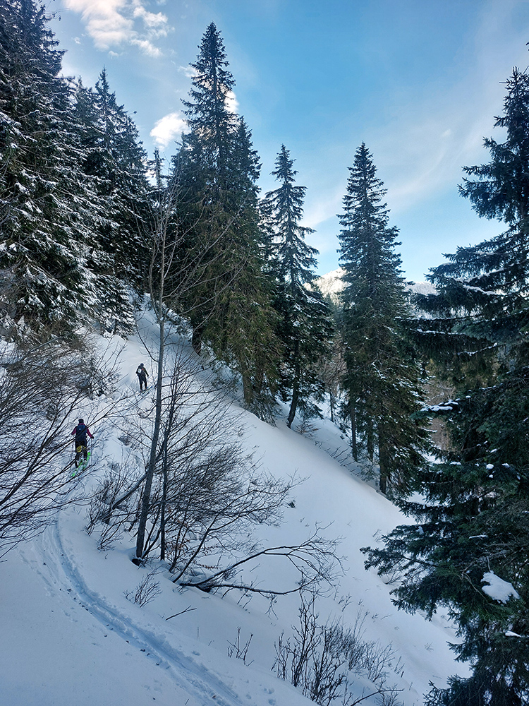 Lyžovačka od kríža po východnom rebre smerom k Limbe prekvapivo dobrá – na drsnom a tvrdom, ale takmer rovnom podklade. Občas snehová doska, nižšie už to na slnku vlhlo. Tak sme len zatočili doľava, na žltú značku, nalepili a davaj nazad do sedla. Tam je chodník pešiakmi z Limby predupaný poriadne.