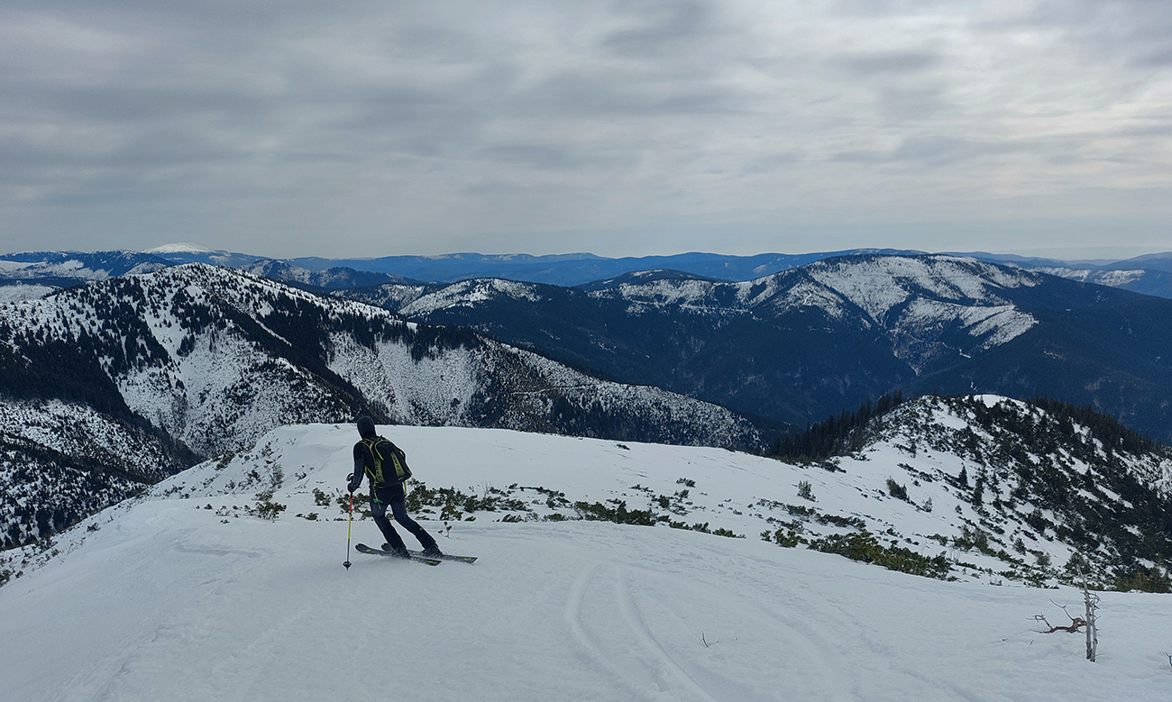 Zároveň sa ale otvárajú výhľady a počasie hovorí, že „východný centrál“ Besnej si asi necháme na koniec, tam teraz ešte zima bude, a teda hrkotavo. Ako prvý skúsime hrebienok z vrcholu na juhovýchod. A opláca sa! Hore trochu prituhnutý, nižšie už odmäknutý firn, ale rovný, také oblúky sa dajú rezať, že až!